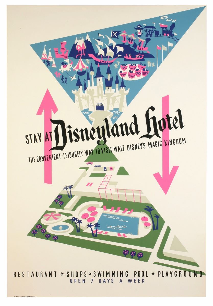 (Disneyland, 1956) Original hand-silkscreened poster for Disneyland's "Disneyland Hotel". This Bjorn Aronson measures 54"x36". In very good condition.