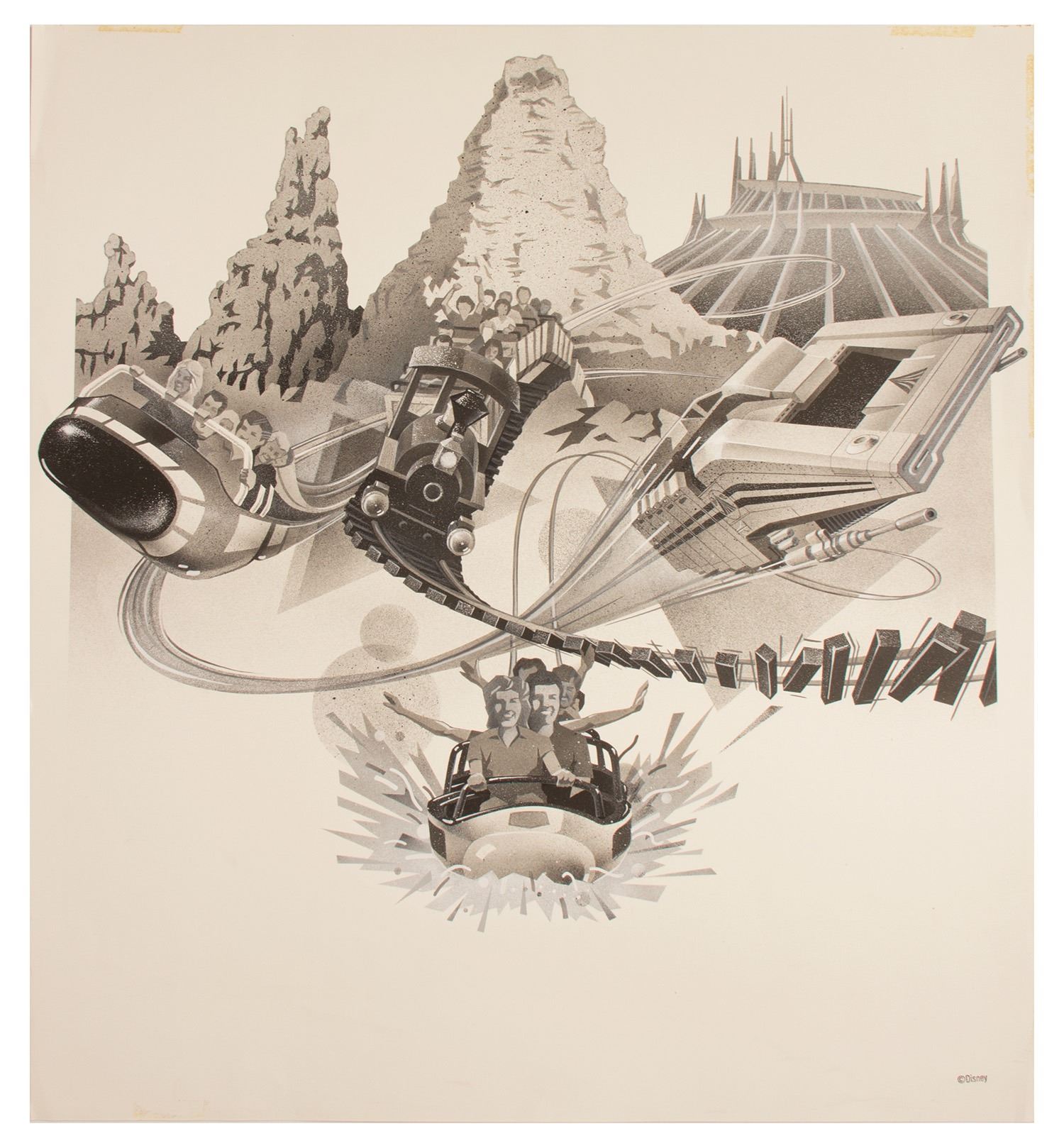 (Disneyland, c.1980s-90s) An original painting featuring the "Mountains of Disneyland" and their respective attraction vehicles. The painting is believed to have been used in either newspaper promotion or internal cast member materials around the time Star Tours debuted, and depicts Big thunder Mountain, Space Mountain, and the Matterhorn, with a Star Tours vehicle jetting across the page. Accomplished in acrylic and airbrush on 24"x21.5" art paper, the painting is in very good condition with some tape residue along the edges.