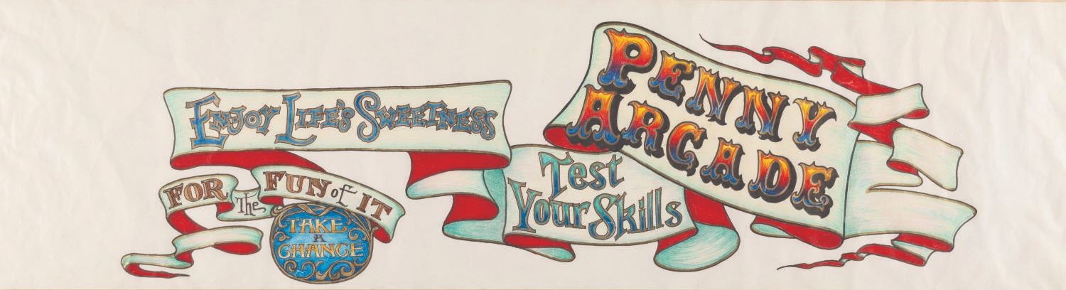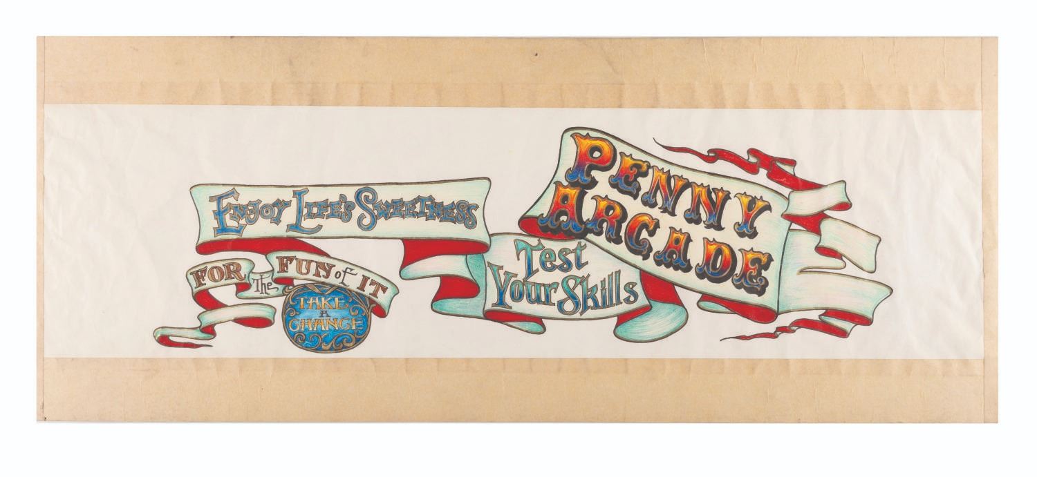 (Disneyland, 2000s) Original concept art for a sign in the Penny Arcade on Main Street U.S.A. at Disneyland. Measuring 5.5" x 18.25" on 9.5" x 24" artists' board, the artwork is accomplished in colored pencil, ink, and paint, and is in very good production-used condition.
