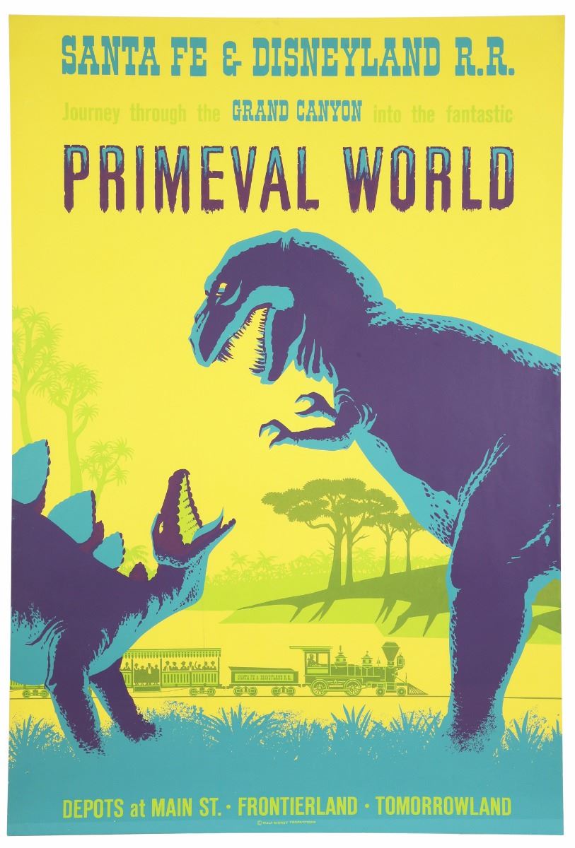 (Disneyland, 1966) Original hand-silkscreened poster for the "Primeval World" attraction at Disneyland. Designed by Claude Coats. Measures 54"x36". In good condition with a 6" crease to the left-side of the poster. This poster has a few vertical streak marks in the yellow background, which are the result of a printing flaw at the time these posters were created. This flaw is very common with this particular poster.