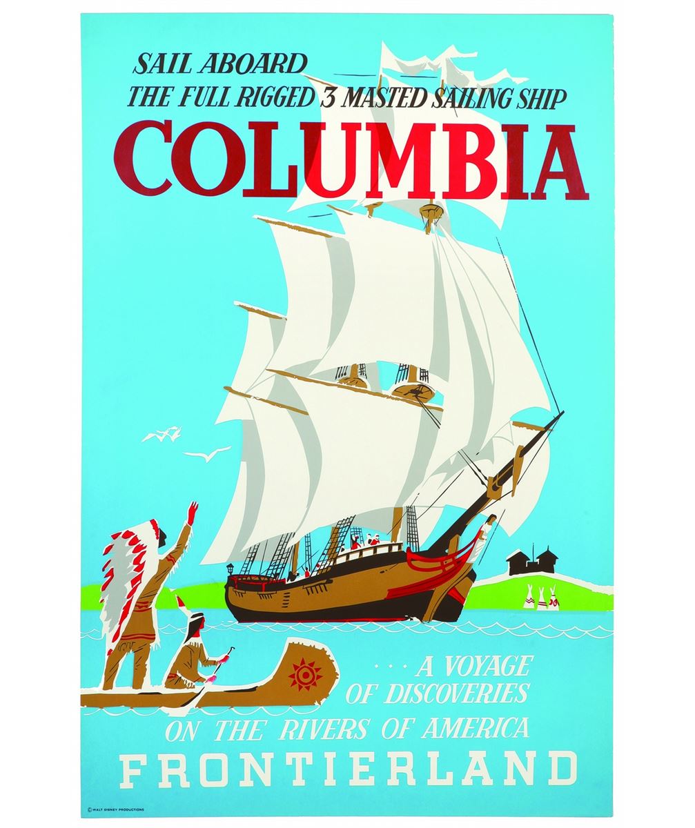 (Disneyland, 1958) Original hand-silkscreened poster for the Disneyland Sailing Ship Columbia attraction. Designed by Bjorn Aronson, this poster measures 54”x36”. In very good to near fine condition with slight wear to right edge including creasing, chipping, and tiny 0.15” tears near the upper right corner.