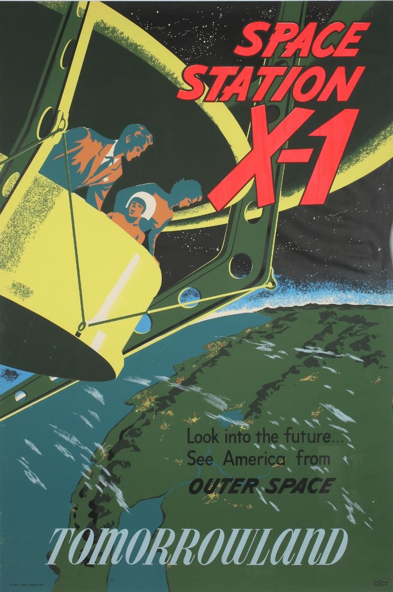 (Disneyland, 1956) Rare original hand-silkscreened poster for the "Space Station X-1" attraction in Tomorrowland. Opened in 1955, this walk-through attraction gave guests the illusion of traveling through space. It closed in 1960 and was replaced by the Art of Animation exhibit. This Bjorn Aronson designed poster measures 54”x36”. In very good condition with light staining from moisture on the right edge and light scratches and scuffs throughout the image.