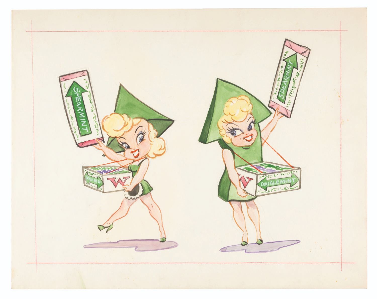 (Schlesinger, 1940s) Original artwork for proposed new characters for Wrigley’s gum advertisements. Accomplished in mixed media, the art has a character image size of 9.5” x 8” on 13.5” x 10.75” art paper and is in very good condition with light spotting.