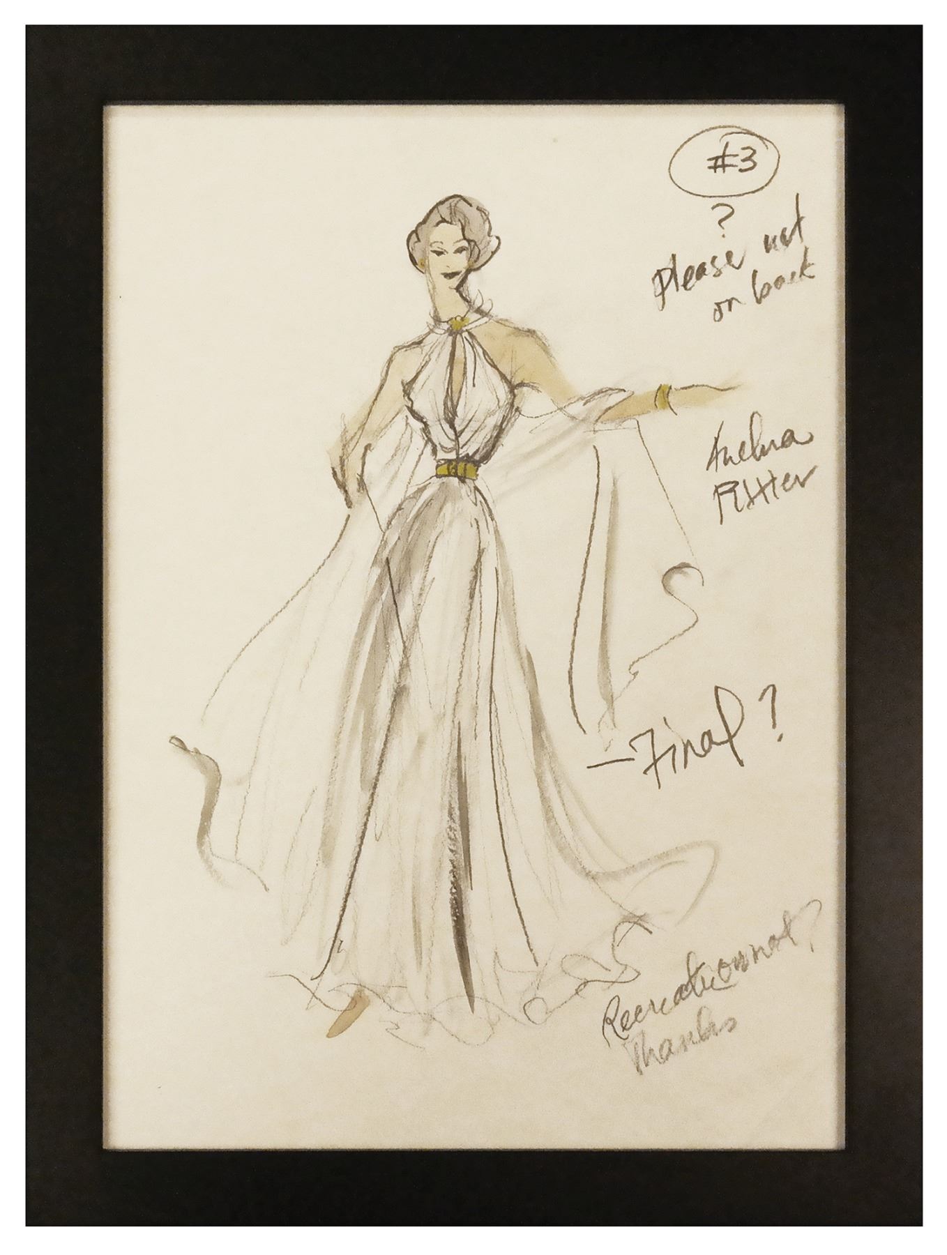 (CBS, 1962) An original costume design by legendary fashion designer Edith Head for The Lucy Show. Accomplished in watercolor and colored pencil, the artwork measures 16.75"x 12.25" and is in very good condition with some minor discoloration and wear from use.