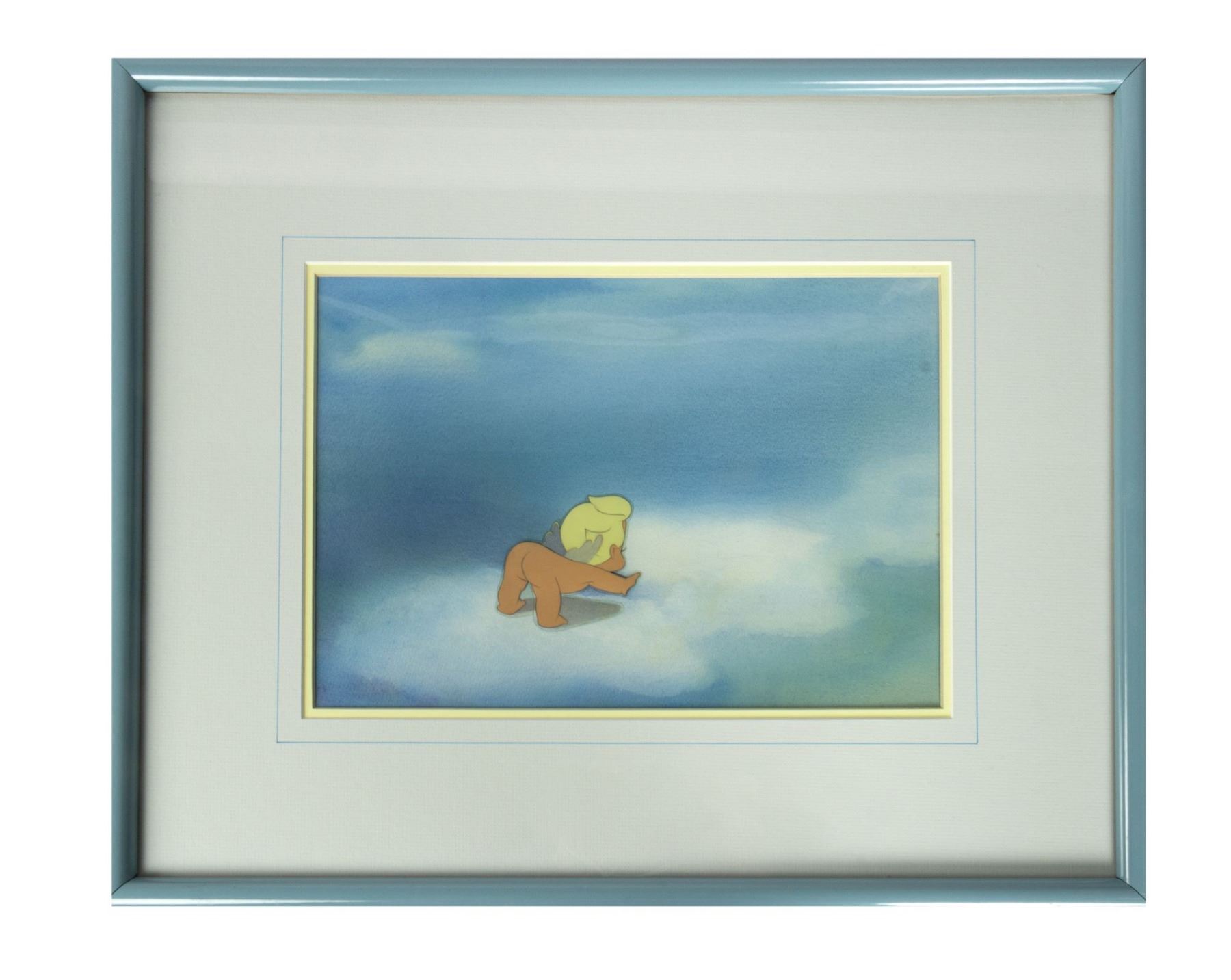 (Walt Disney Studios, 1940) An original hand-painted production cel of a cherub from Fantasia. The cel layer has been trimmed to the image and placed over a hand-painted reproduction background for display. The character image measures 2.5"x2.75" on the 8.25"x12" background, and is in a 16.5"x20" frame. The cel has not been inspected out of frame, but appears to be in very good condition with minor wear from age.