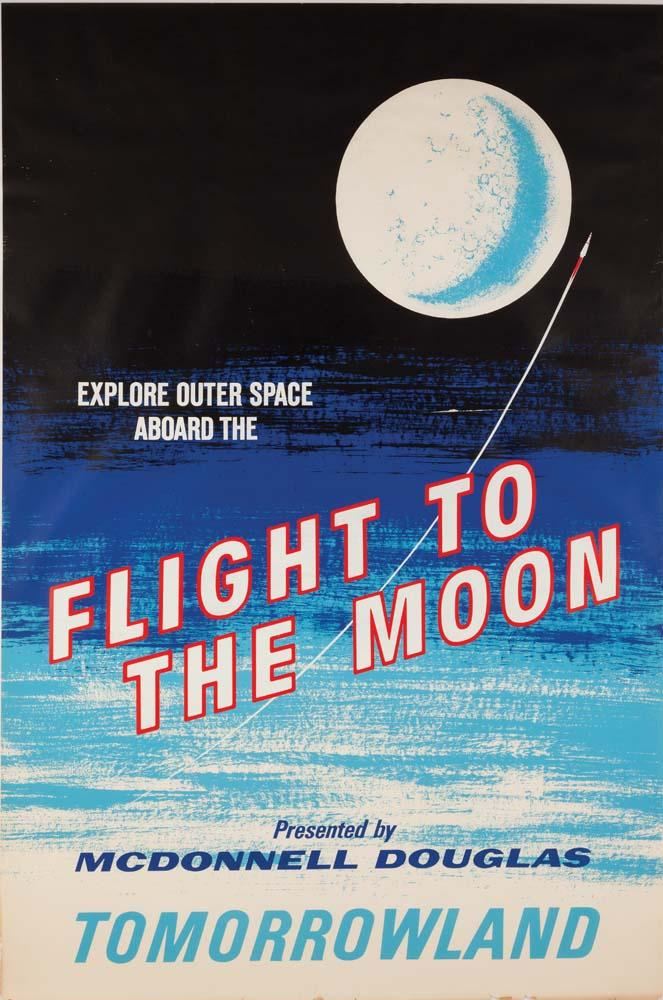 (Disneyland, 1967) A stunning original color silk-screened poster for the Disneyland Flight to the Moon attraction. Measuring 36 x 54 in. with bright and vivid colors and striking imagery. In vintage fine condition.
