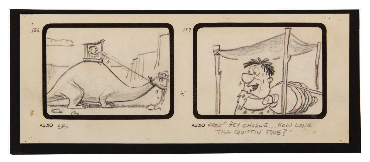 (Hanna-Barbera, 1960) An Original storyboard panel from "The Snorkasaurus Hunter". This panel was part of two large Storyboards used to pitch the show to the networks in 1959. It eventually aired as episode 18 in the first season. Measuring 4.5"x11.75", the story board panel sheet has been mounted to a 5"x12.5" cardstock and is in very good condition.