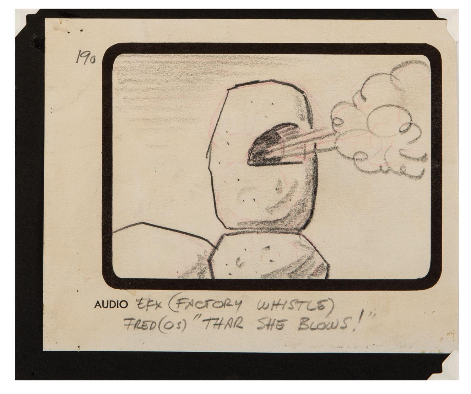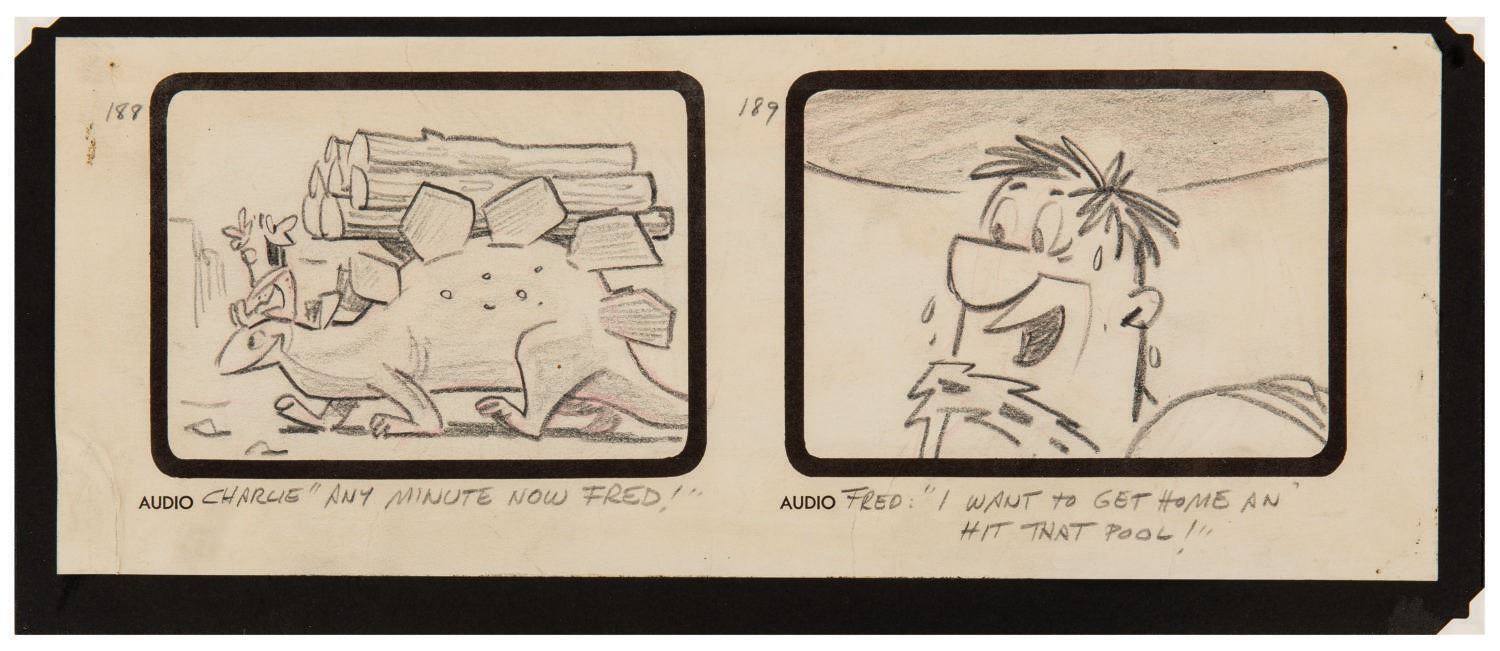 (Hanna-Barbera, 1960)  An Original storyboard panel from "The Snorkasaurus Hunter". This panel was part of two large Storyboards used to pitch the show to the networks in 1959. It eventually aired as episode 18 in the first season.  The story board panel sheets have been mounted to a 14"x11" cardstock and are in very good condition.