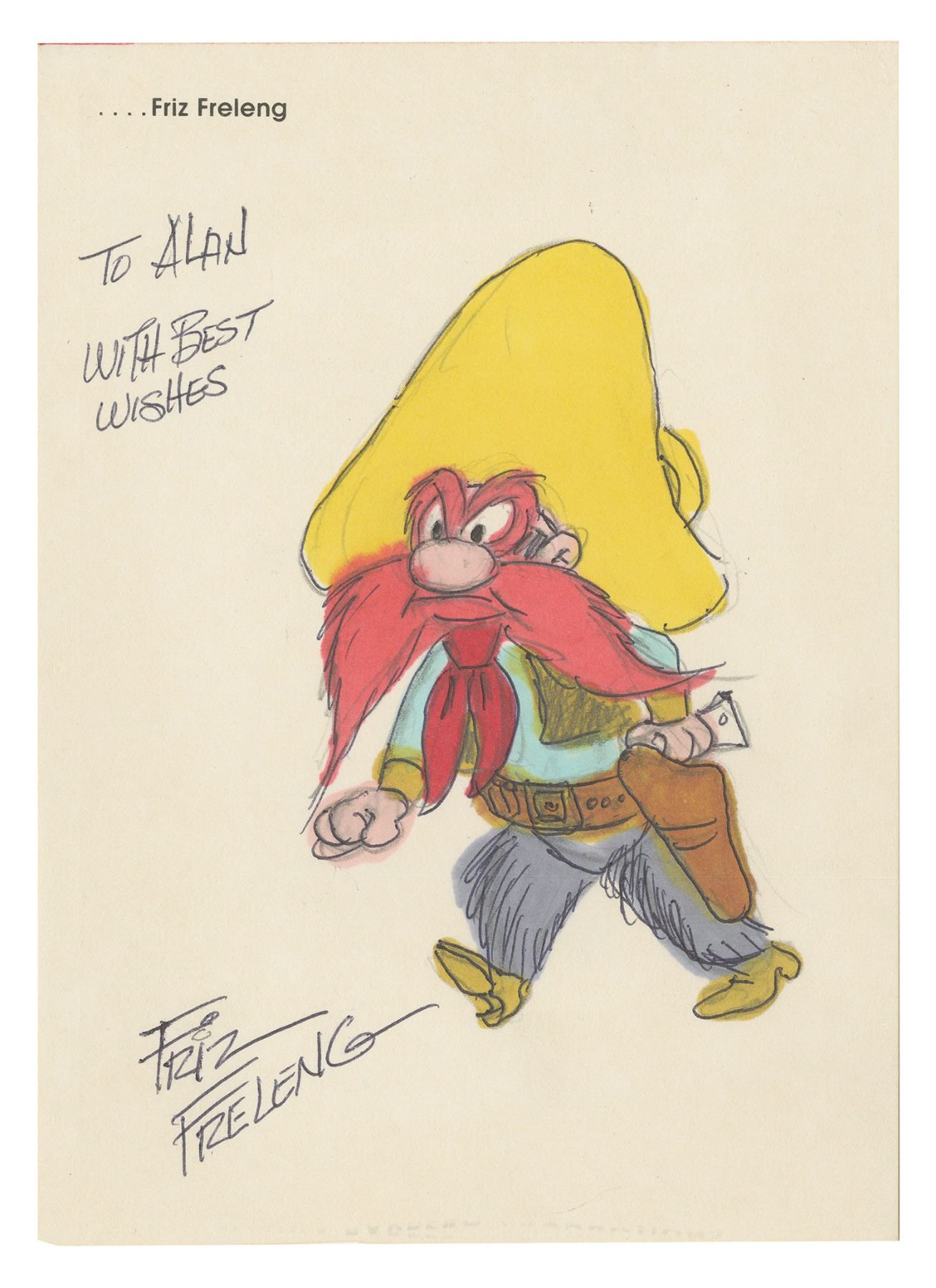 (Warner Bros., c.1980) An original drawing by animation legend Friz Freleng, depicting Yosemite Sam. Freleng is known for helping to develop such notable Warner Bros. characters as Bugs Bunny, Tweety, Sylvester, and, as depicted in this drawing, Yosemite Sam. The drawing is accomplished in ink and hand-colored, and was written with a greeting to a fan, Alan, with Freleng's signature along the bottom. Measuring 7.5"x5.5", the drawing is in very good condition with minor wear from use.