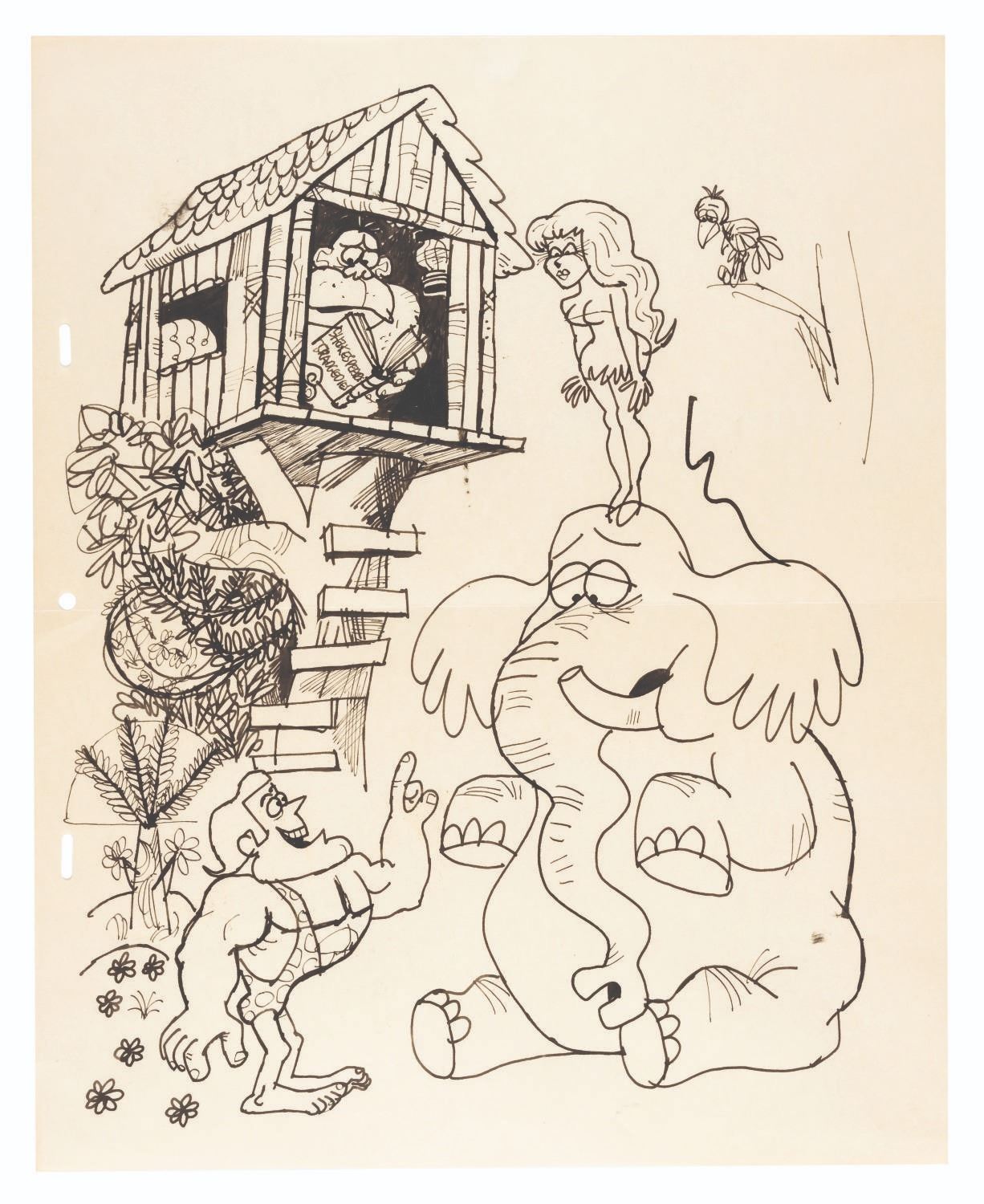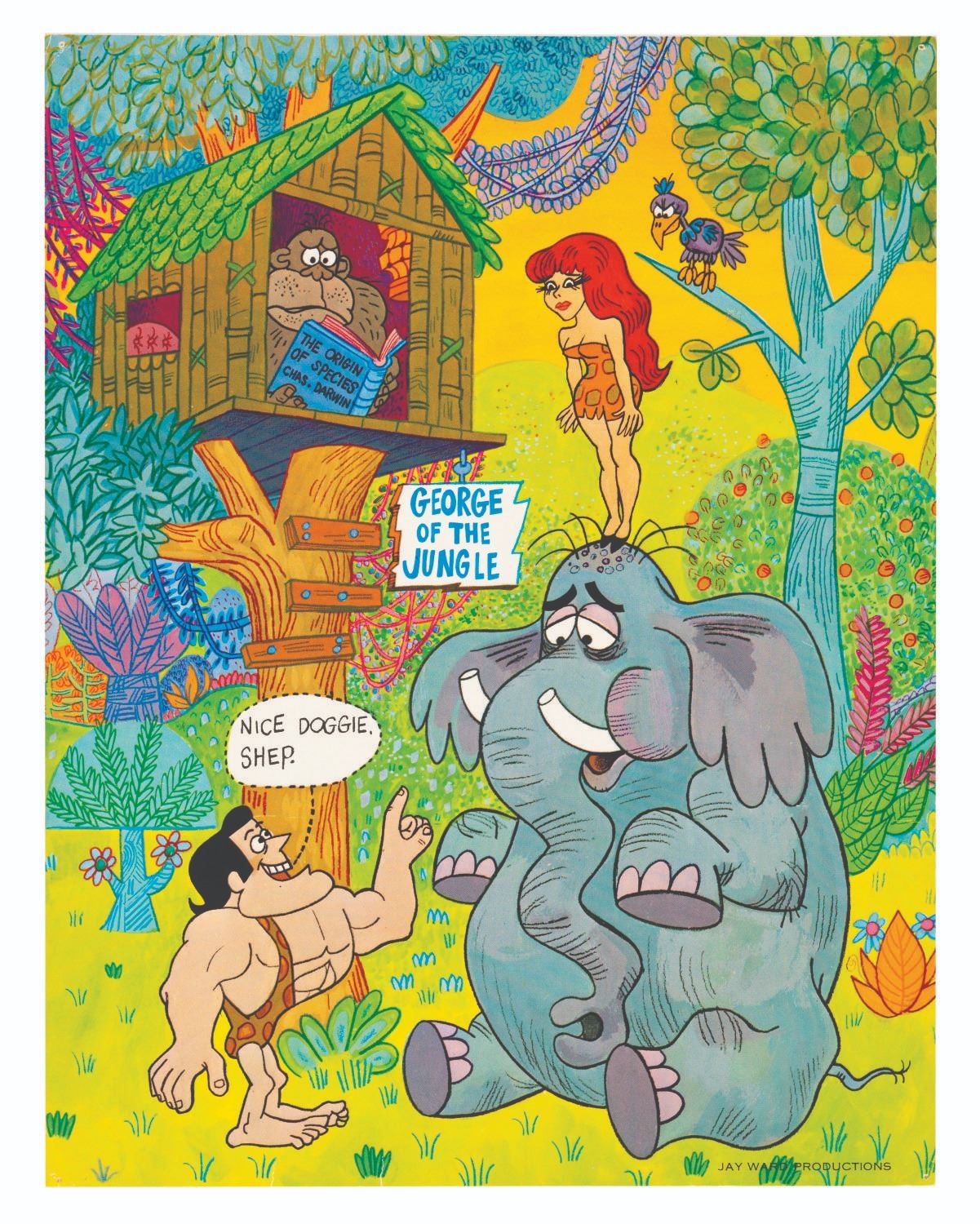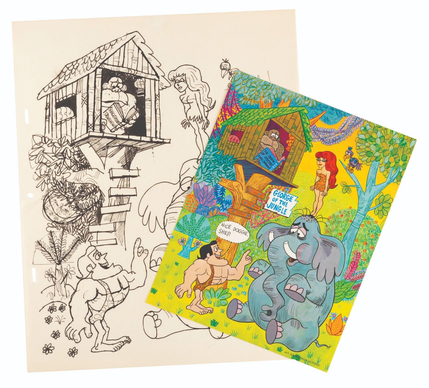 (Ward, 1967) An original hand-drawn illustration for “George of the Jungle” for promotion or merchandise, paired with the final color print. Measuring 15.5” x 12.5”, the ink illustration displays in good condition with light edge wear, creasing, smudging, a horizontal fold across the center, and light discoloration from age. The color print measuring 8.5” x 11” is in very good condition with corner pinholes.