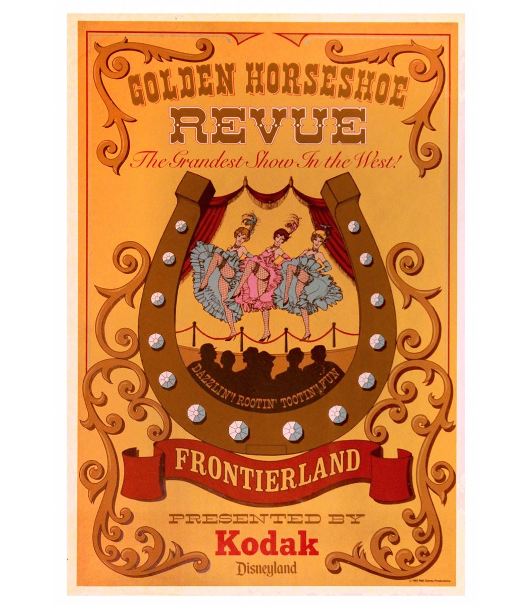 (Disneyland, 1979) A very rare 1970s variation poster for the Disneyland Golden Horseshoe Revue attraction. Silkscreen on tyvek paper measuring 36 x 54 in. with bright and vivid colors and striking imagery. In vintage fine condition.