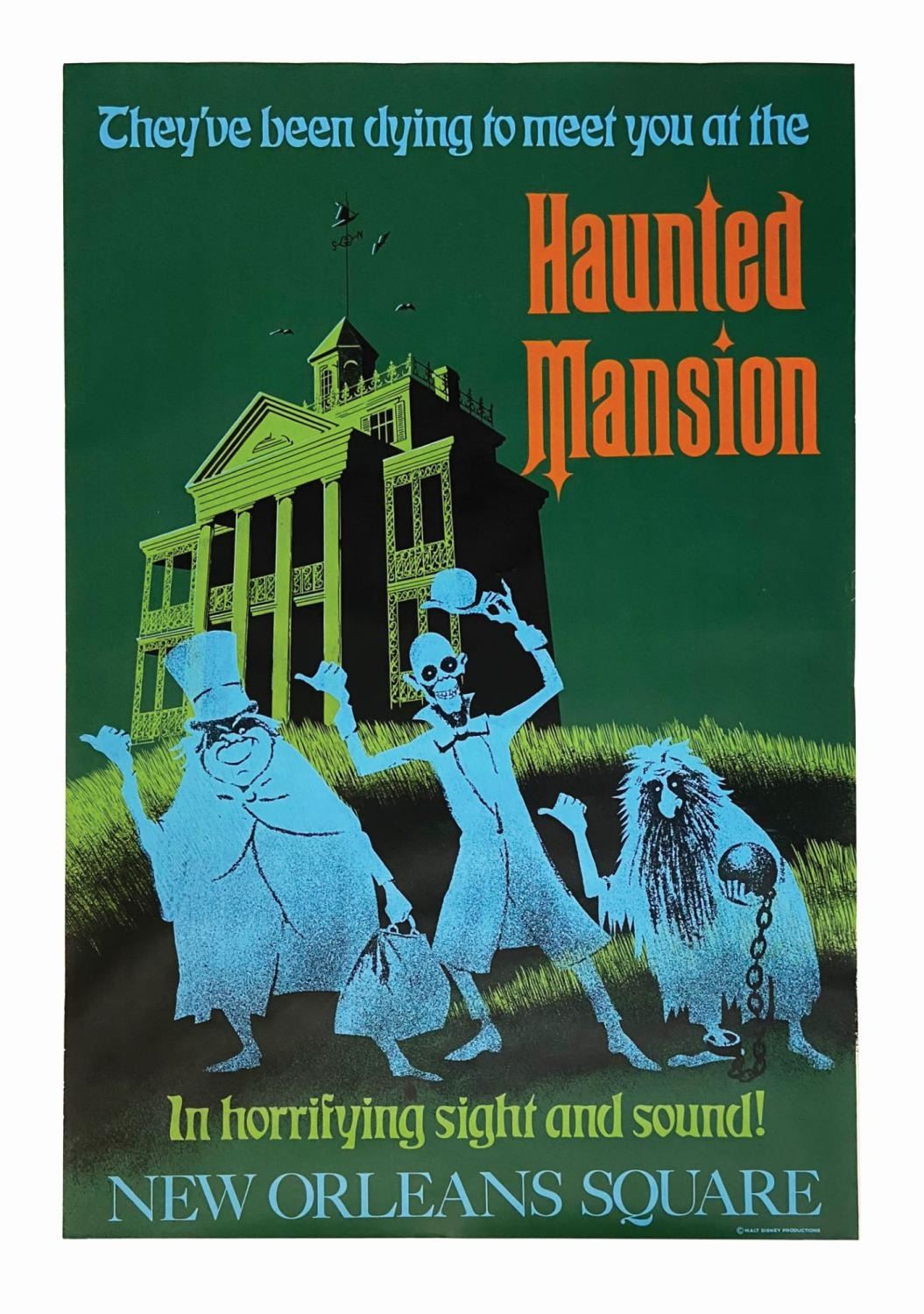 (Disneyland, 1969) An original hand-silkscreened attraction poster for Disneyland's Haunted Mansion. This poster was designed by Imagineers Ken Chapman and Marc Davis and features iconic imagery of the Hitchhiking Ghosts in front of the Mansion itself. This poster is one of the most sought-after early attraction posters due to the continued popularity of the attraction as well as its stunning imagery. The poster measures 54"x36" and is in very good condition, exhibiting some minor edge-wear and a few small creases throughout.