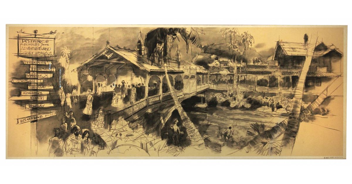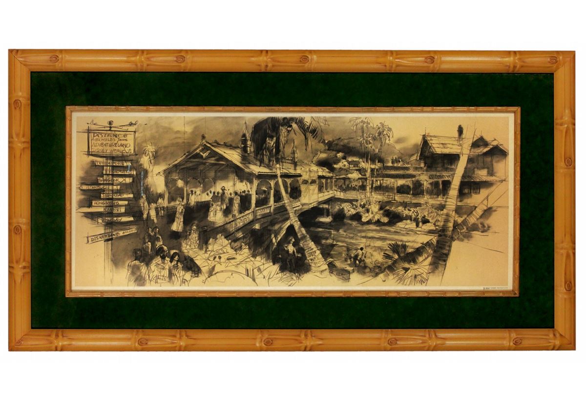 (Walt Disney World, 1969) Beautiful 28 x 20.5 in. concept drawing by Herb Ryman for the Adventureland entrance at Walt Disney World. Framed size is 39 x 32 in. In fine condition. Unexamined out of frame.