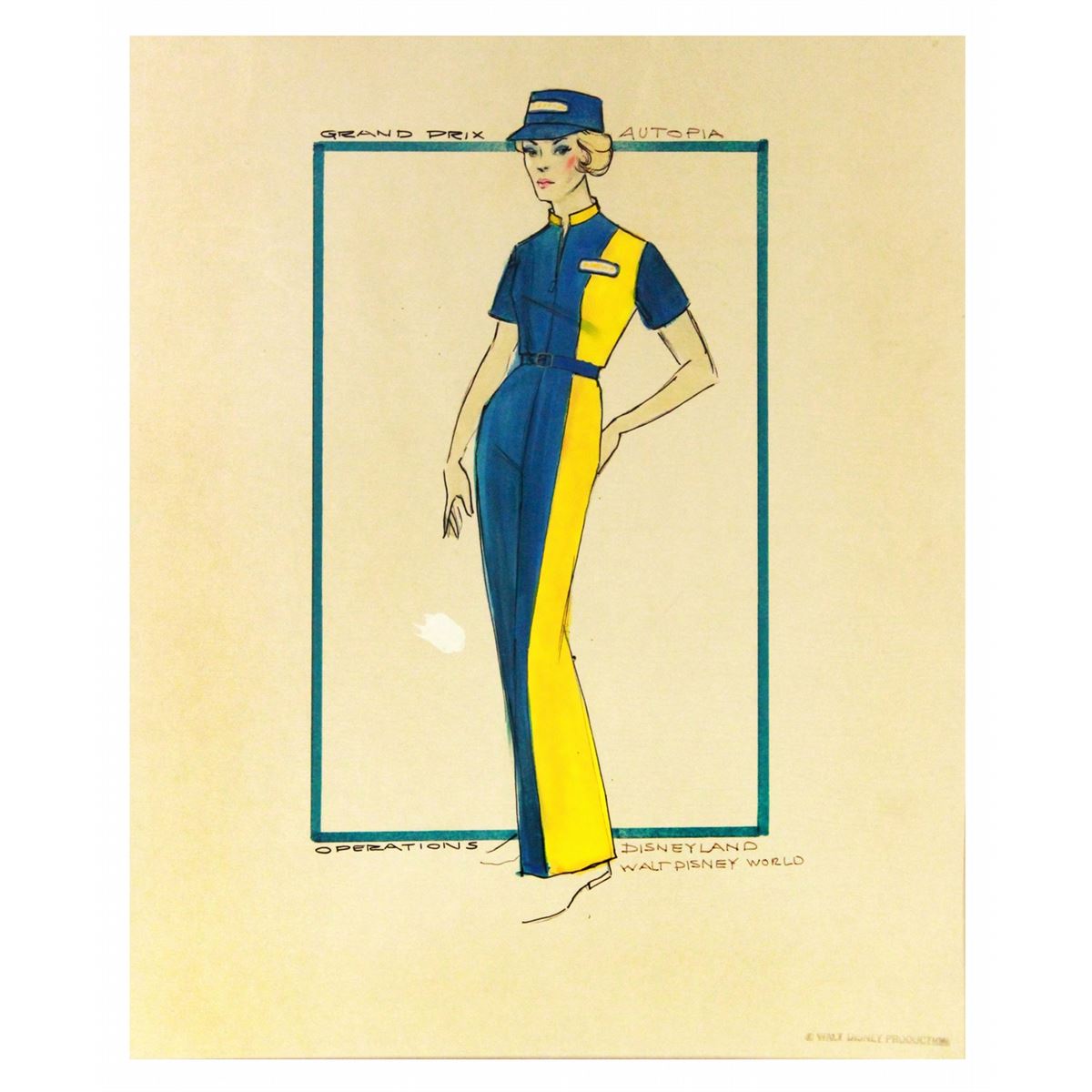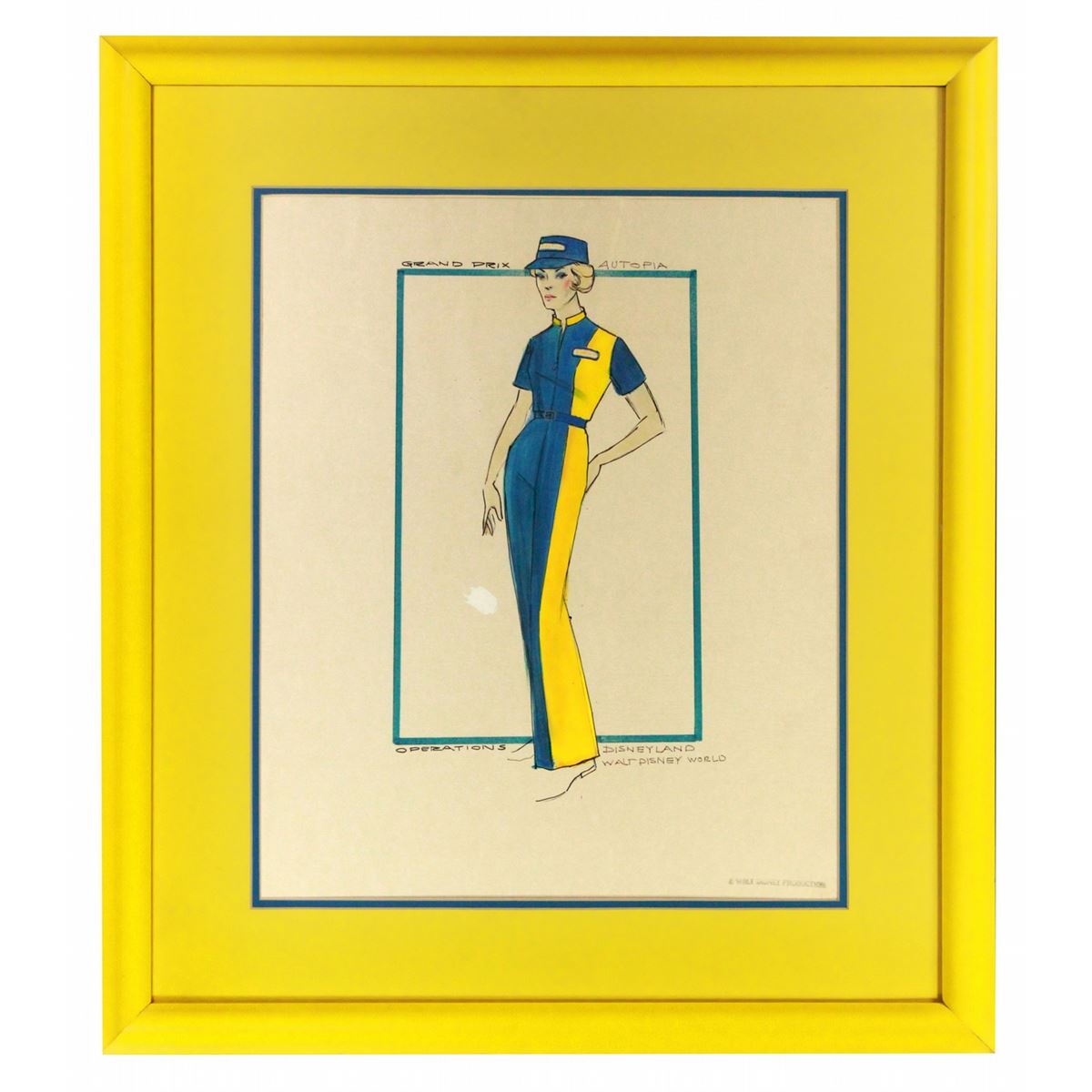 (Disneyland, 1967) Original costume design art by imagineer John Hench, featuring his rendering of the female cast member costume. Accomplished in graphite and pastel on ?? x ?? in. artists’ board. In fine condition.