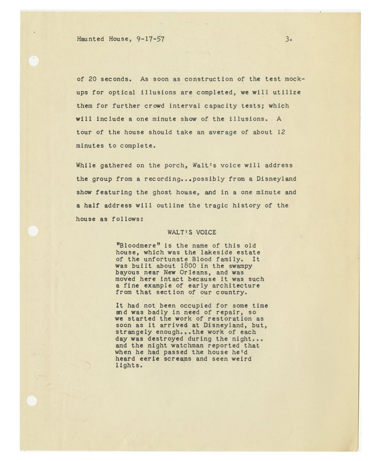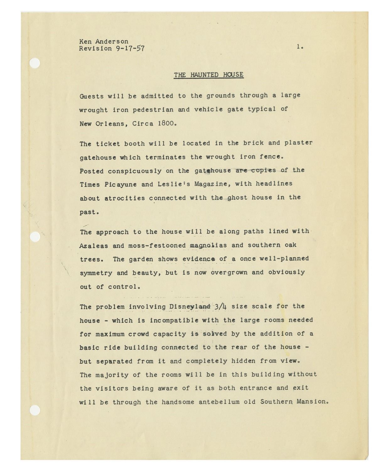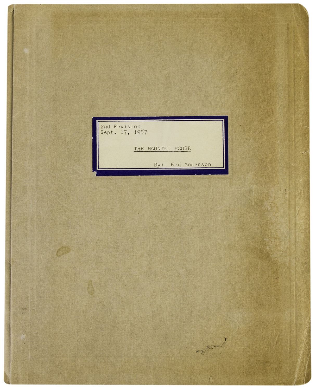 (Disneyland, 1957) An extremely rare original script for the "Haunted Mansion" written by Imagineer Ken Anderson. This script was created in September of 1957, nearly twelve years before the attraction would open. While the "Haunted Mansion" would change and evolve over the years into its current incarnation, this script offers a remarkable opportunity to see how the attraction would have looked during some of its earliest stages of development. This script includes the entire story of the attraction, as proposed by Anderson in 1957. This includes the dialogue from the never-realized "Lonesome Ghost", as well as cast member dialogue, and an opening narration by Walt Disney. The script further describes various gags and spooky elements which would have been seen in the Mansion, and describes the history of the "Blood Family" who own "Bloodmere", an original proposed name for the Mansion. This 27-page document comes in a protective folder which reads "The Haunted House by Ken Anderson - 2nd Revision Sept. 17, 1957" on the front label. The script measures 11.5"x9" and is in very good condition with some yellowing to the cover from age.