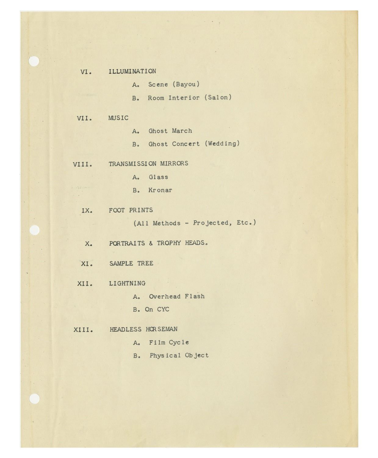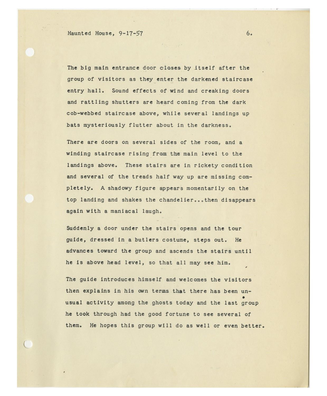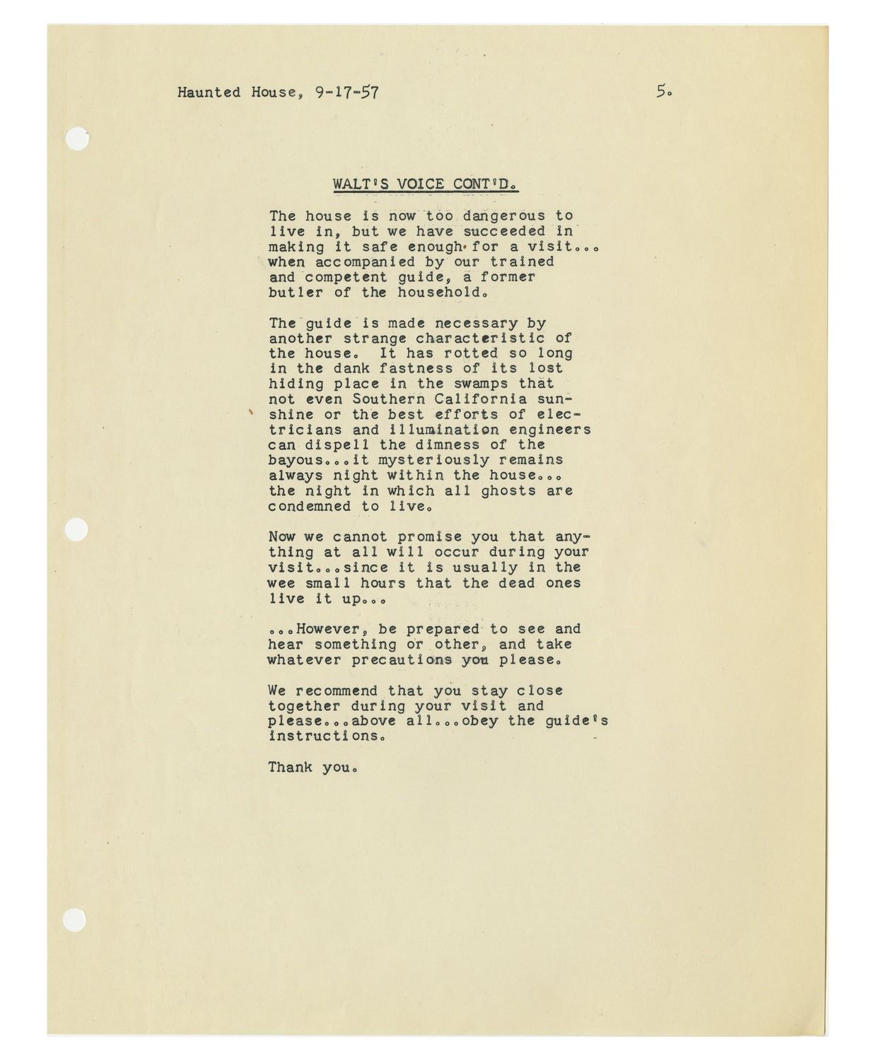(Disneyland, 1957) An extremely rare original script for the "Haunted Mansion" written by Imagineer Ken Anderson. This script was created in September of 1957, nearly twelve years before the attraction would open. While the "Haunted Mansion" would change and evolve over the years into its current incarnation, this script offers a remarkable opportunity to see how the attraction would have looked during some of its earliest stages of development. This script includes the entire story of the attraction, as proposed by Anderson in 1957. This includes the dialogue from the never-realized "Lonesome Ghost", as well as cast member dialogue, and an opening narration by Walt Disney. The script further describes various gags and spooky elements which would have been seen in the Mansion, and describes the history of the "Blood Family" who own "Bloodmere", an original proposed name for the Mansion. This 27-page document comes in a protective folder which reads "The Haunted House by Ken Anderson - 2nd Revision Sept. 17, 1957" on the front label. The script measures 11.5"x9" and is in very good condition with some yellowing to the cover from age.