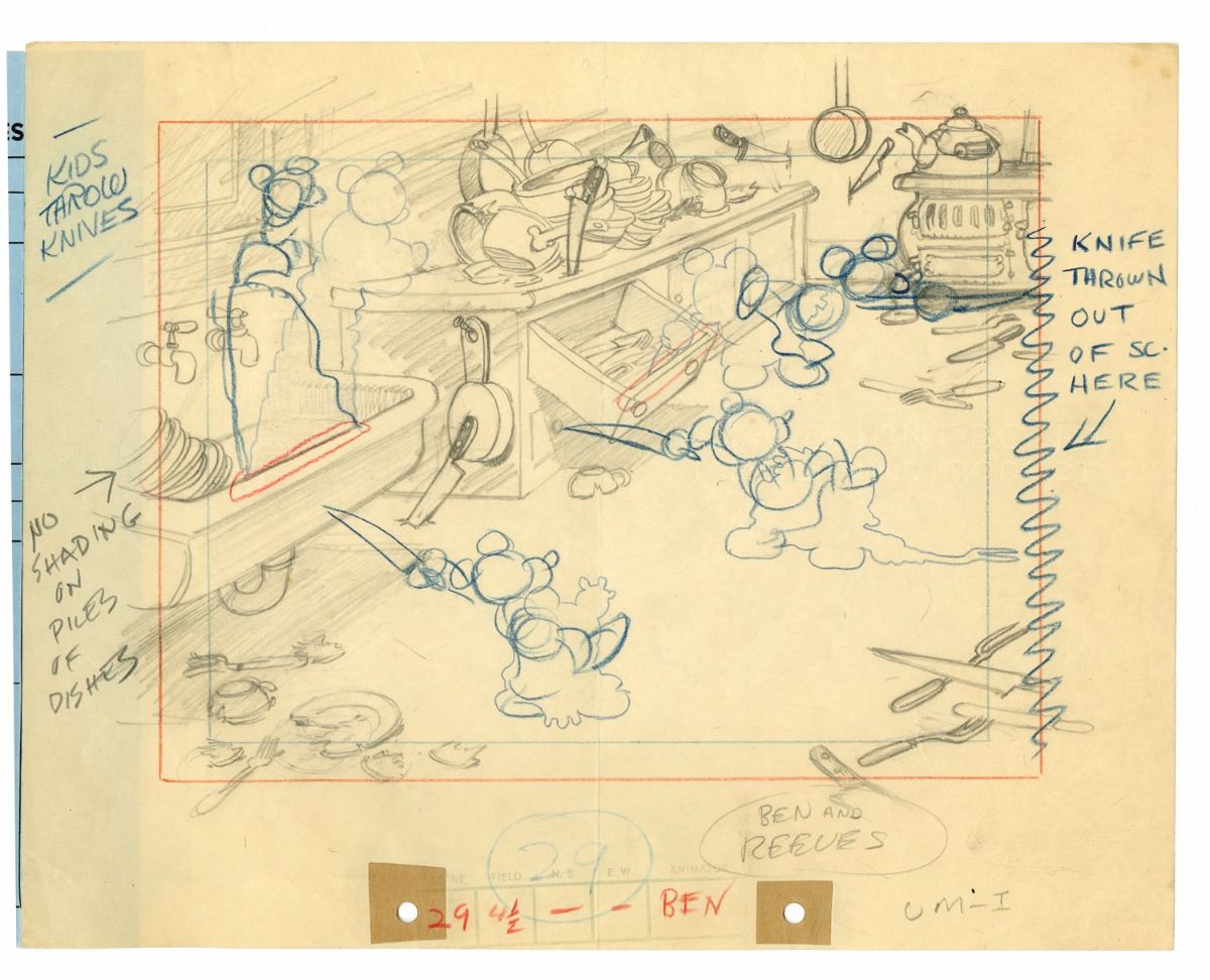 (Walt Disney Studios, 1932) Original background layout drawing from "Mickey's Nightmare". Accomplished in graphite on untrimmed 9.5"x12" animation paper with an image side of 7"x9.25". Contains several hand-written scene notes around the border. In very good condition with minor wear and a faint vertical fold mark down the center.