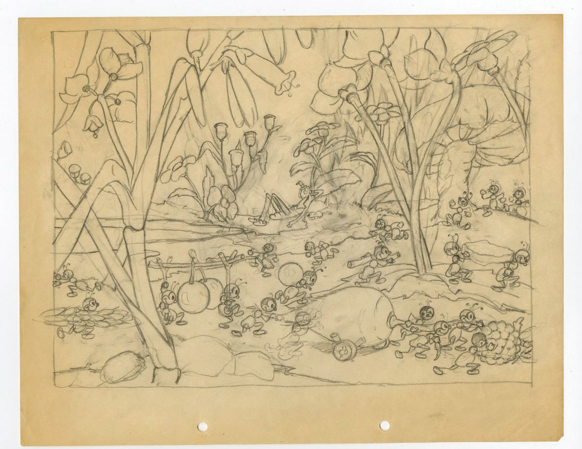 (Walt Disney Studios, 1934) Original layout drawing from "The Grasshopper and the Ants". Accomplished in graphite on untrimmed 9.5"x12" animation paper. Image size measures 8"x11". In very good condition with minimal wear.