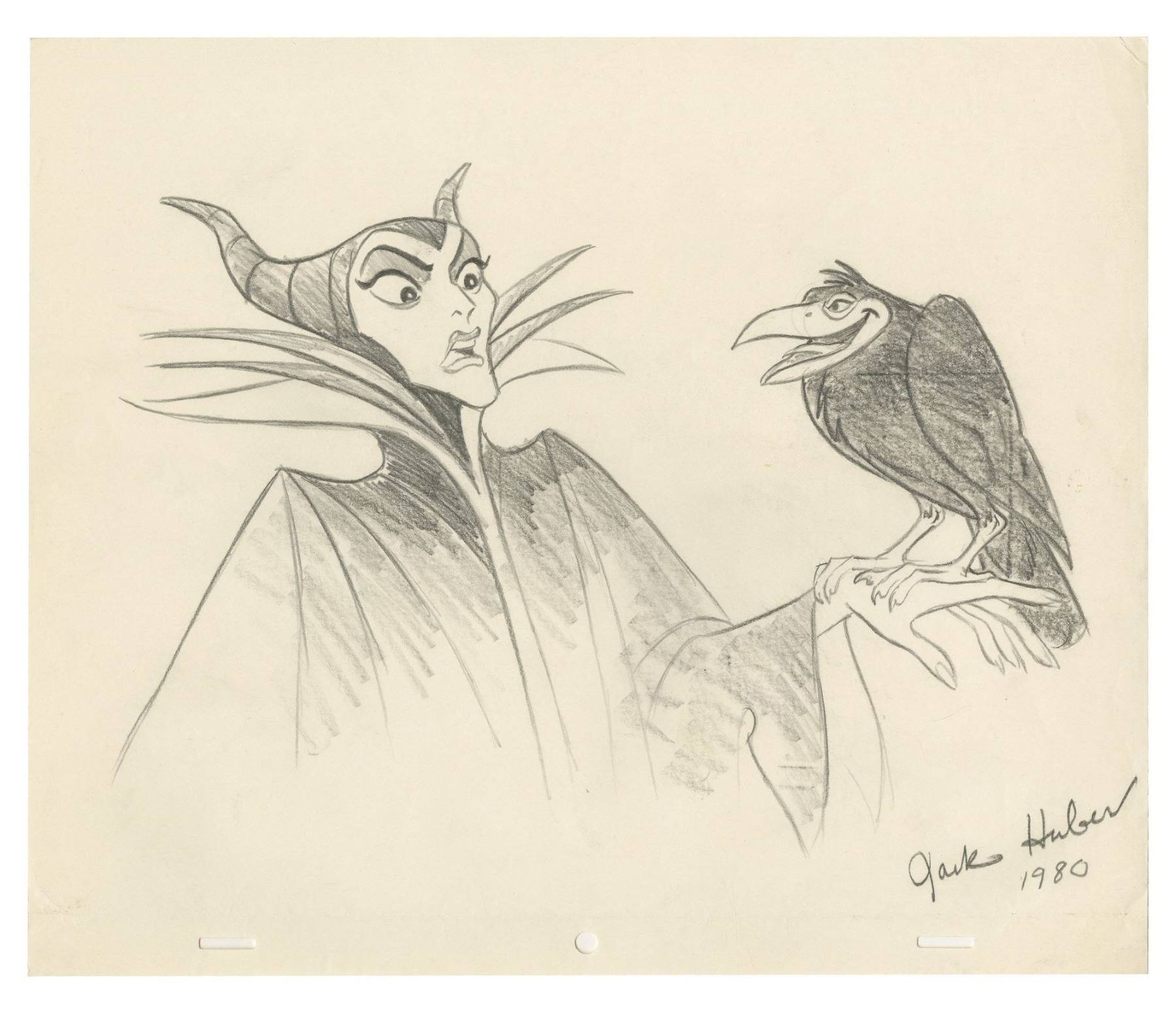 (Walt Disney Studios, 1980) An original drawing by layout artist Jack Huber of Maleficent and Diablo from Sleeping Beauty. Created in pencil on 3-hole animation paper, the drawing measures 10.5"x12.5" and is in very good condition. Huber signed the bottom-right corner.