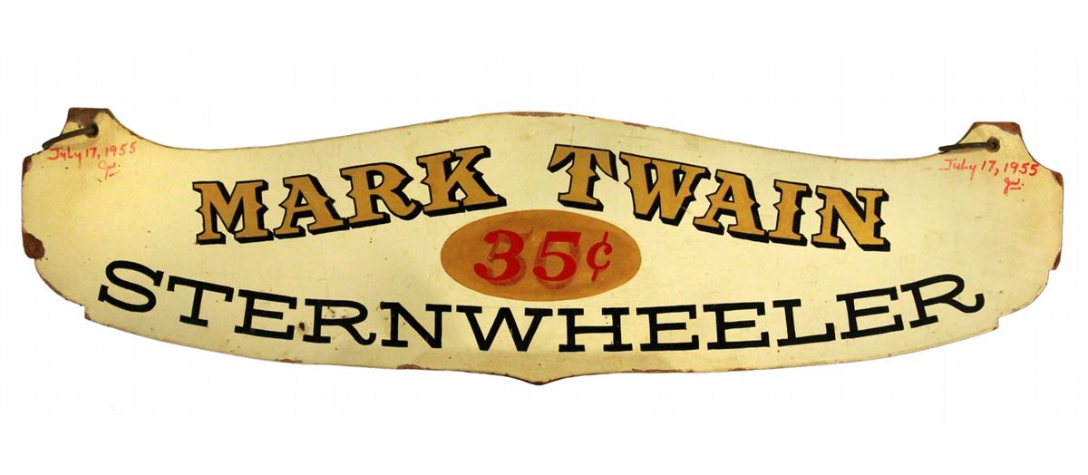 (Disneyland, 1955) An amazing artifact from the grand-daddy of all Disneyland conveyances: The Mark Twain Sternwheeler Riverboat. This two-sided, hand painted wooden sign hung at the ticket booth directly at the entrance to the Mark Twain dock boathouse. It reads 35¢ (painted over 50¢; most likely as a last minute price adjustment), pre-dating specific ticket letters. The reverse side reads “Closed” and would be displayed once the attraction closed for the day. This sign came from a collection of a retired Disneyland employee from the early years of the park. . It is marked “July 17, 1955” with the initials, J.W.” by the employee. The date (Disneyland’s opening day) and initials were added much later, after the sign was retired from several years of use. Measuring 24 x 6 in. and in good condition overall.