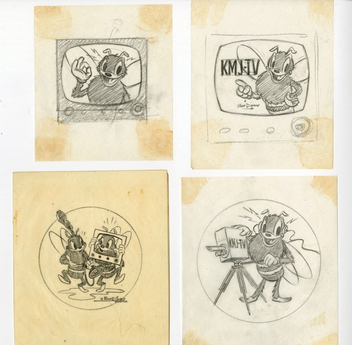 (Walt Disney Studios, 1953) The studio would often create mascot designs for businesses. This collection of (4) original artwork sketches were made for KMJ-TV in Fresno, Ca, and feature their mascot, Scoopy the Bee. KMJ went on the air in 1953.