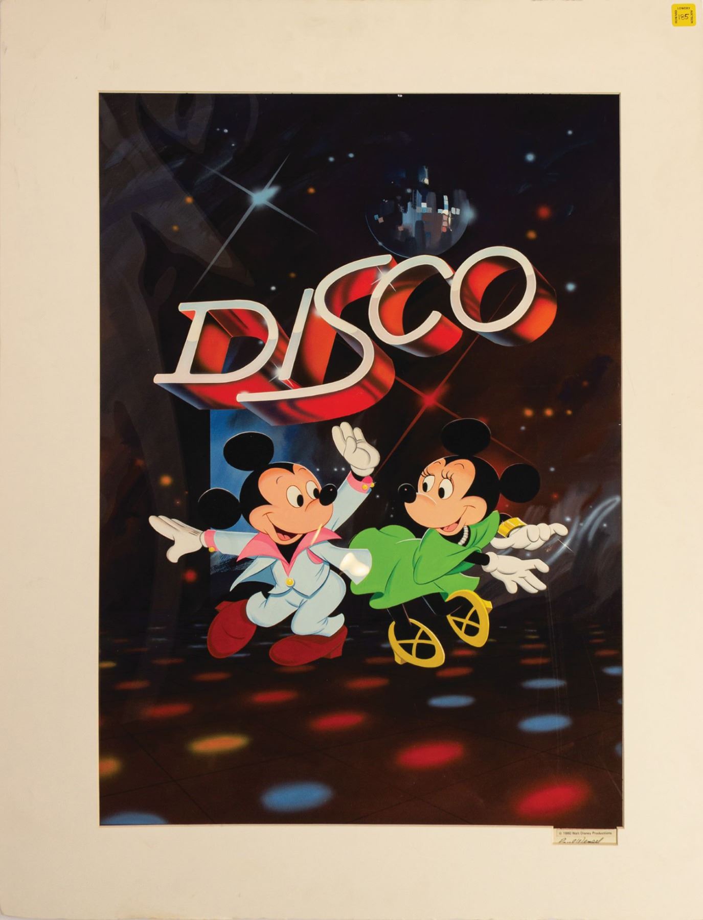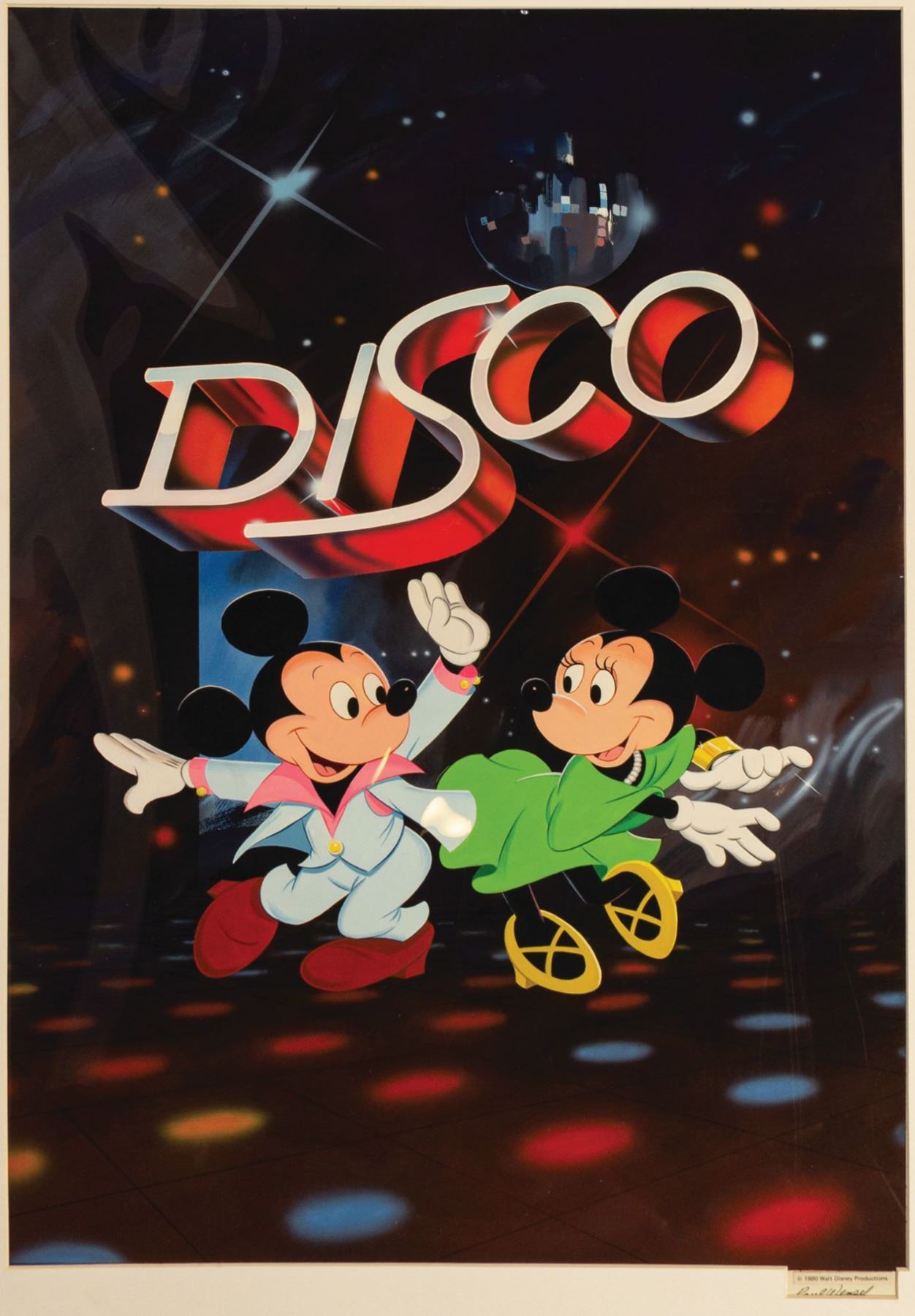 (Disney, 1980) An original Mickey Mouse Disco poster illustration by Disney artist Paul Wenzel. This artwork was used on the theatrical poster for the short film “Mickey Mouse Disco” that was released in 1980. The artwork is accomplished in tempura and airbrush on art board within a mat frame. It is signed by Paul Wenzel in the lower right margin. The art measures 32"x21.25" within the 40"x29.5" mat. The item is in fine condition with minor wear to the mat.