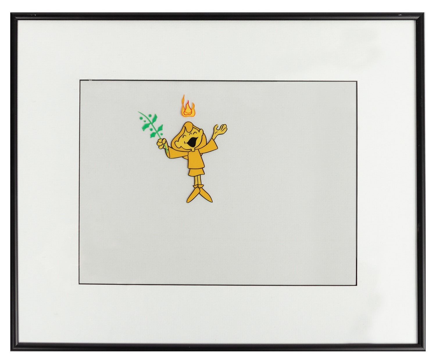 (UPA, c.1962) An original animation cel from Mr. Magoo's Christmas Carol. This cel features the Ghost of Christmas Past, and an image size of 4.5"x4" within its 14.25"x17.25" frame. The artwork has not been examined out of frame, but appears to be in very good condition with minor wear to frame from use.