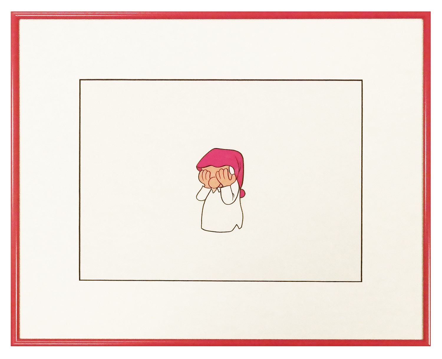 (UPA, c.1962) An original animation cel from Mr. Magoo's Christmas Carol. This cel features Mr. Magoo as Scrooge, and has an image size of 3.75"x2.25" within its 14.25"x17.25" frame. The artwork has not been examined out of frame, but appears to be in good condition with minor wear to frame from use. There is a small crack to the paint in the nightcap and wear at the neck.