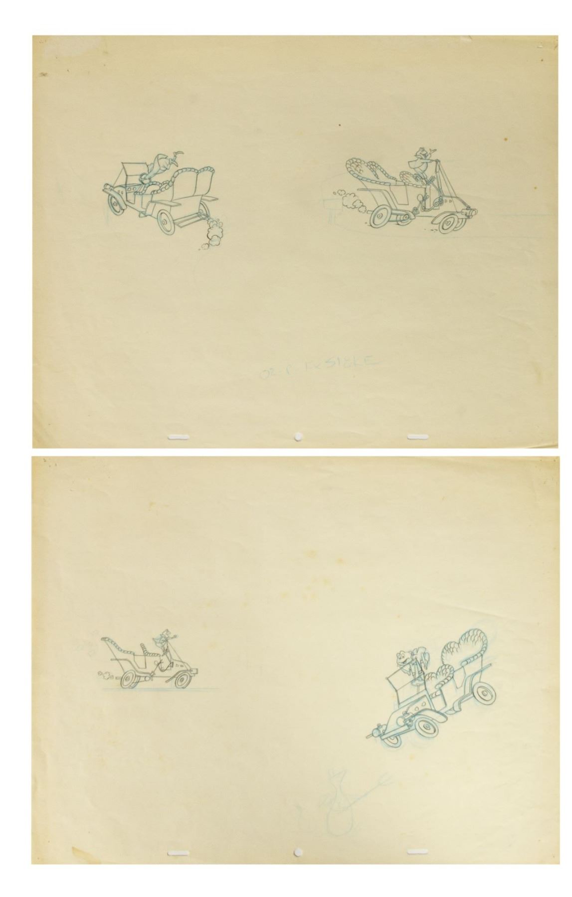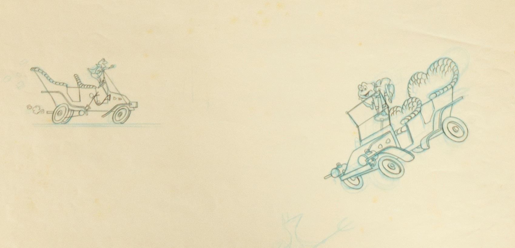 (Disneyland, 1980) Two sheets containing (4) original drawings by Imagineer X Atencio for the Mr. Toad's Wild Ride entrance mural. These drawings feature all (4) depictions of Mr. Toad's car in the entrance mural, which tell the story of Mr. Toad's trip through the countryside and town square before crashing into the train and finally arriving in hell. Accomplished in blue and black pencil on 12.5"x15.5" 3-hole studio animation paper, the drawings are in very good condition with pin-holes in the corners and minor spots of wear from their original use.