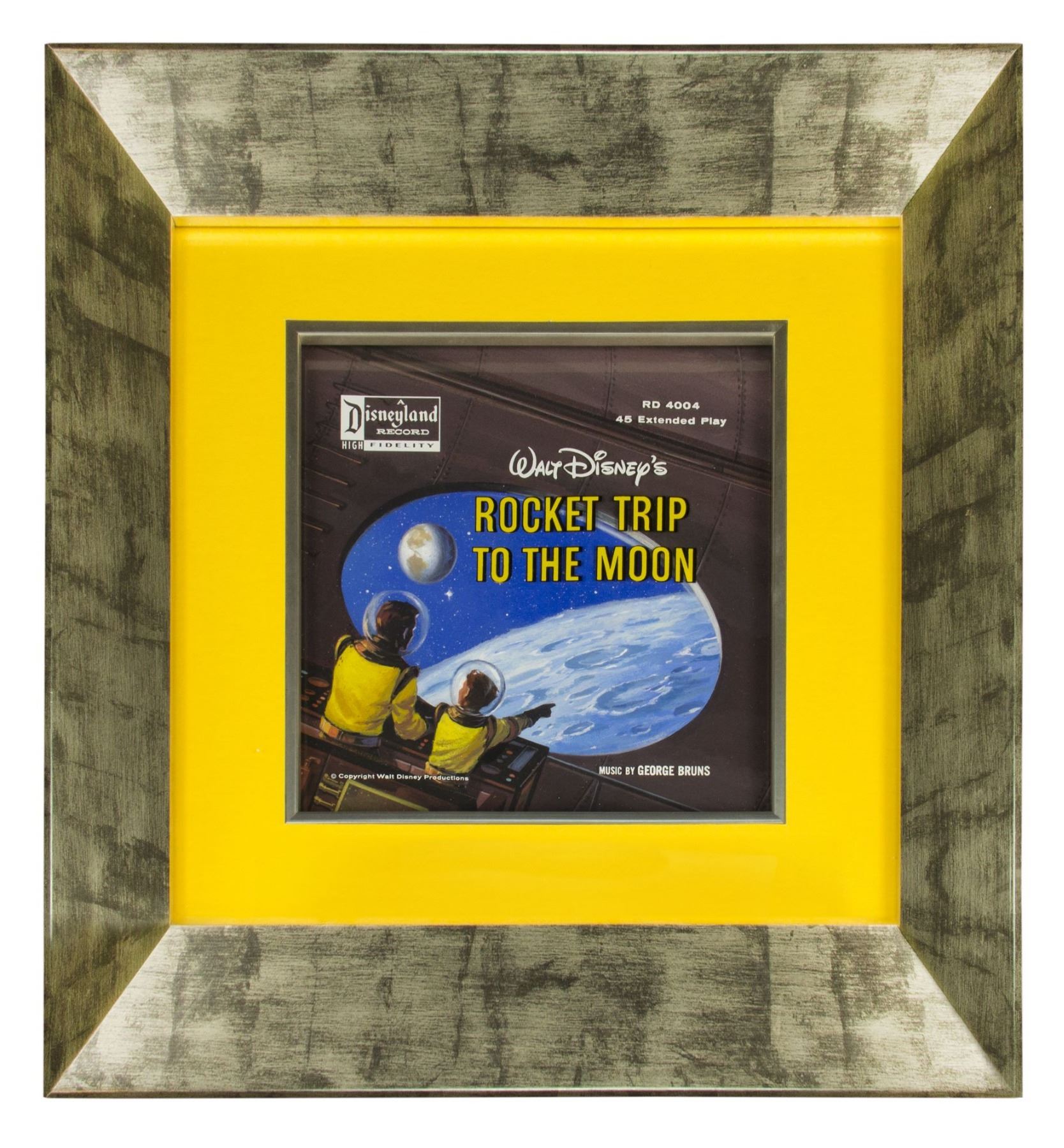(Disneyland, 1956) A beautiful original painting used for the popular Disneyland "Rocket Trip to the Moon" 45rpm record. The artwork is inspired by Disneyland's iconic "Rocket to the Moon" attraction and is accomplished in gouache with a title cel overlay. The painting measures 8"x8" and is in very good condition.