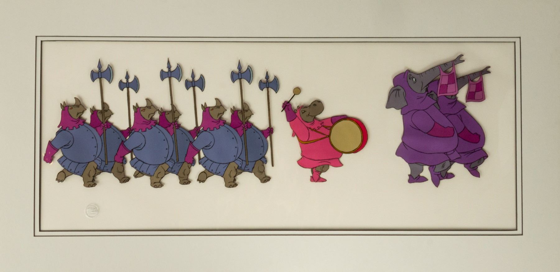 (Walt Disney Studios, 1973) An original panoramic production cel from Walt Disney's Robin Hood. The hand-painted cel features several marching rhino guards, a drumming hippo, and two elephants. This pan cel has an image size of 10"x25" within its 15"x30" mat, and is in very fine condition with little wear. The Walt Disney Company seal is in the bottom-left corner and the foam-core backing has moderate wear around the edges of the reverse.