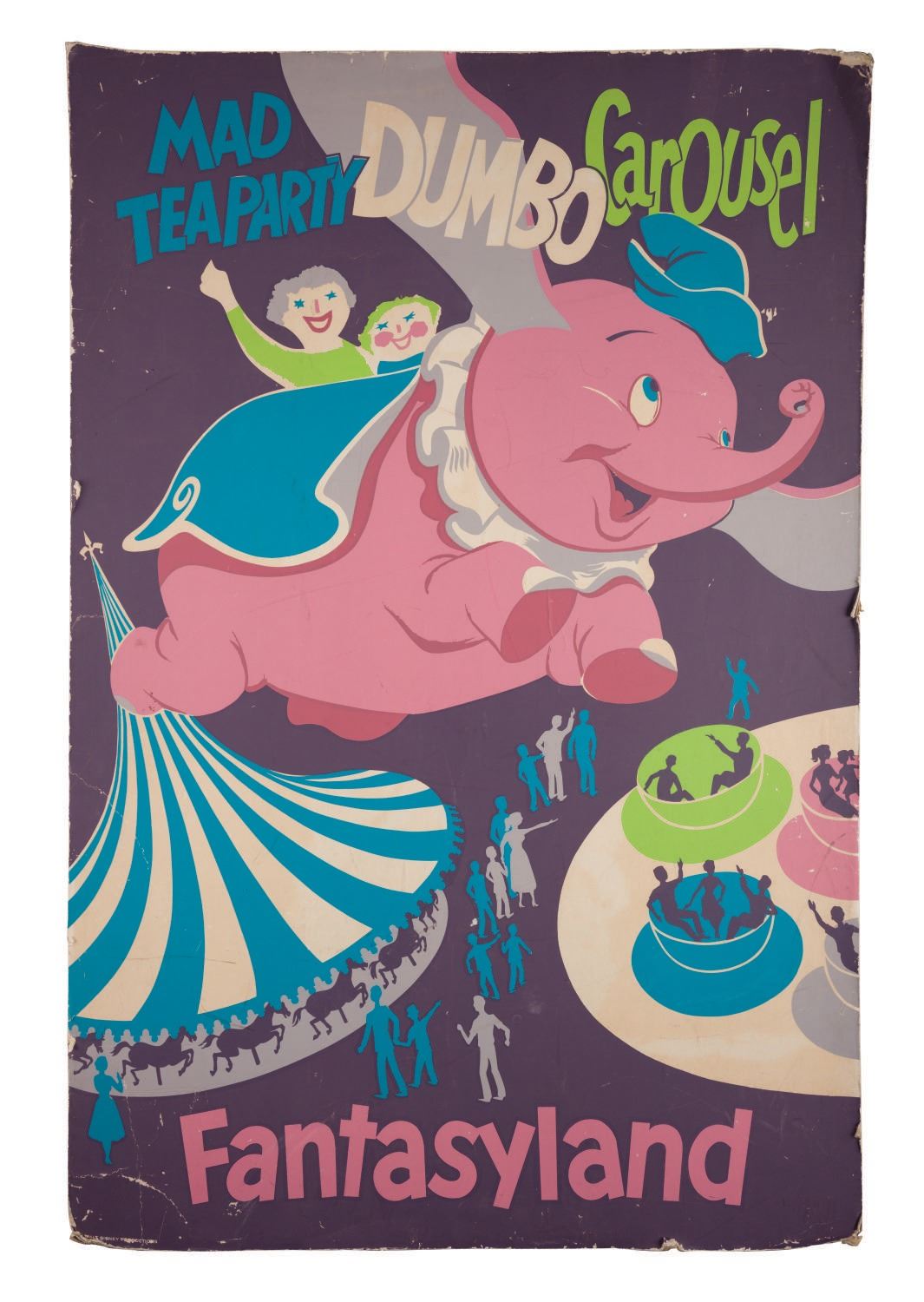 (Disneyland, 1955-60s) A rare original hand-silkscreened poster for Fantasyland at Disneyland. Designed by Bjorn Aronson, the poster features the Mad Tea Party, Dumbo, and King Arthur Carrousel. Mounted on chipboard, this is one of a very few that survived being displayed in the park. Measuring 36"x54", the poster is in good park-used condition, with fading, chipping, creasing, scratches and edge wear throughout. Due to size, this item may require special shipping arrangements, please inquire for details and estimates.