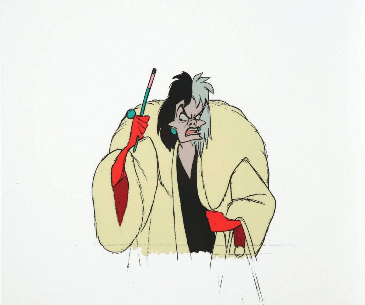 (Walt Disney Studios, 1961) An original hand-painted production cel from the Walt Disney Productions animated feature film "101 Dalmations". This cel features the character Cruella de Vil. The cel measures 10.5"x12.5". In very fine condition.
