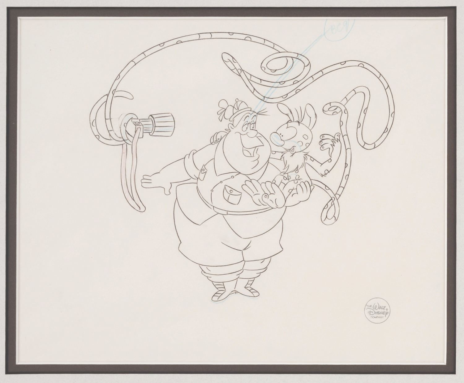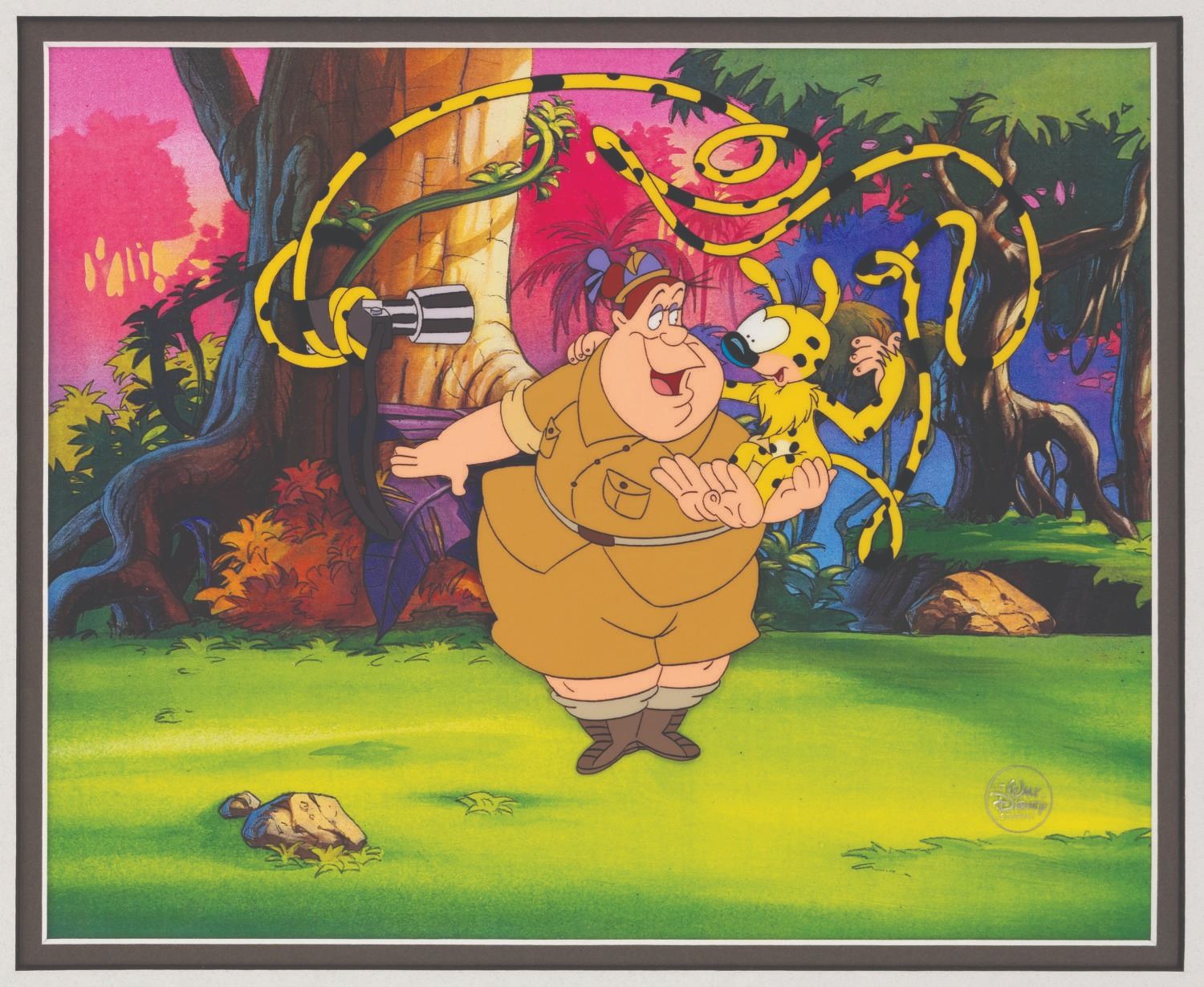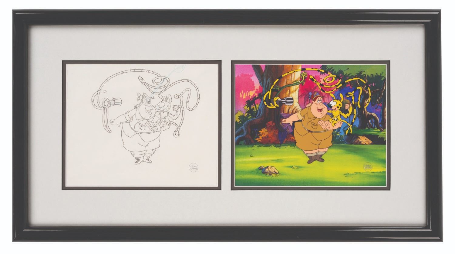 (Disney Television Animation, 1992) A Rare Original Production Cel and Drawing from Disney's"Marsupilami" TV Series. Marsupilami was created by Andre Franquin in 1952, appearing on Raw Toonage in 1992, before premiering on his own television series as part of The Disney Afternoon in 1993. This original cleanup drawing and one–of-a-kind production cel were released through Disney Art Editions. The drawing and cel have character image sizes measuring 8"x7". The entire framed piece measures 31.25"x17"and is in fine condition.