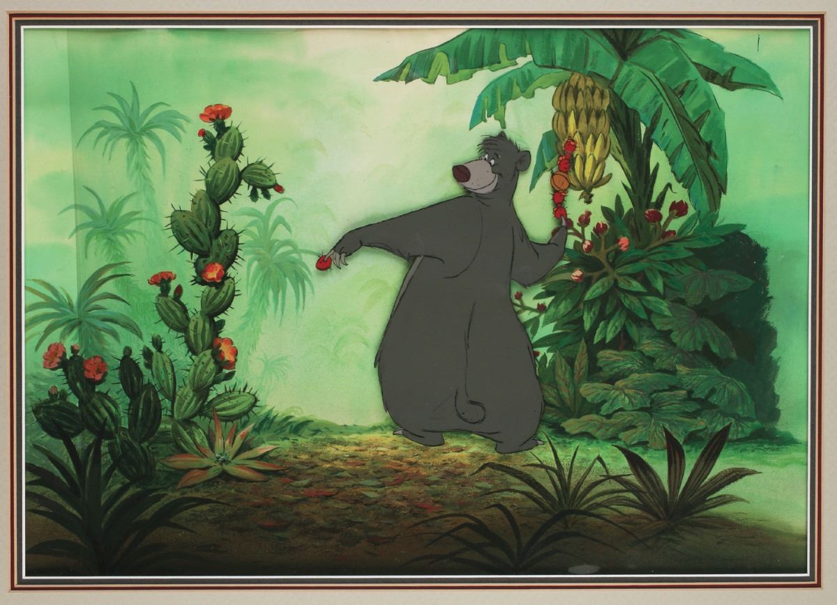 (Walt Disney Studios, 1967) Beautiful original production cels with matching production background from the "Bare Necessities" sequence of "The Jungle Book". The entire piece measures 13"x16". In fine condition.