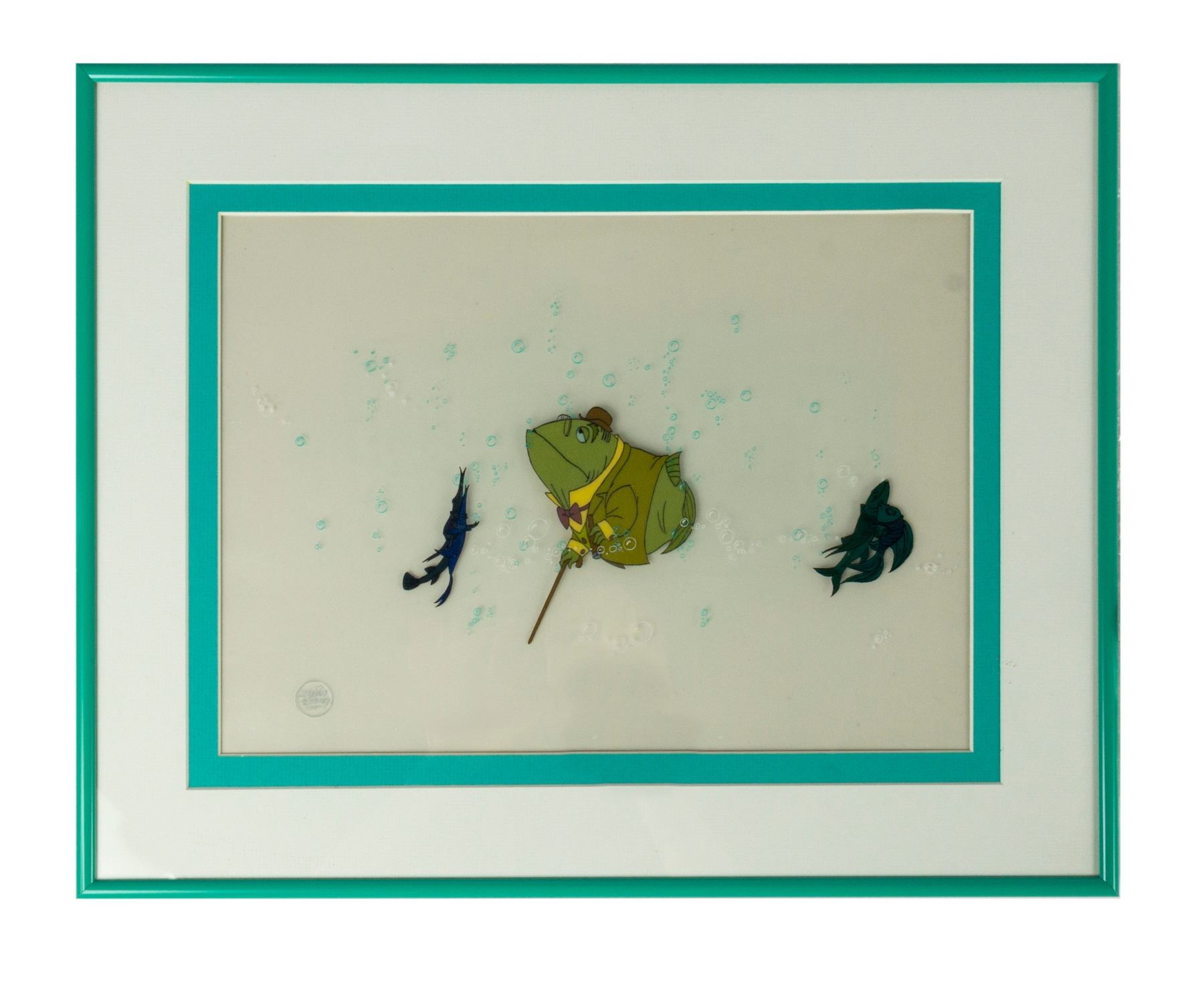 (Walt Disney Studios, 1971) An original group of production cels from Walt Disney's Bedknobs and Broomsticks. The hand-painted cels feature a wonderful image of Mr. Codfish in the center with two dancing fish couples at his sides as well as an effects cel of small bubbles. The Walt Disney Company seal can be seen in the lower-left corner. The cel set-up has an image size of 9.75"x14" within its custom 15.25"x19.25" frame. The cel is unexamined out of frame but appears to be in very fine condition.