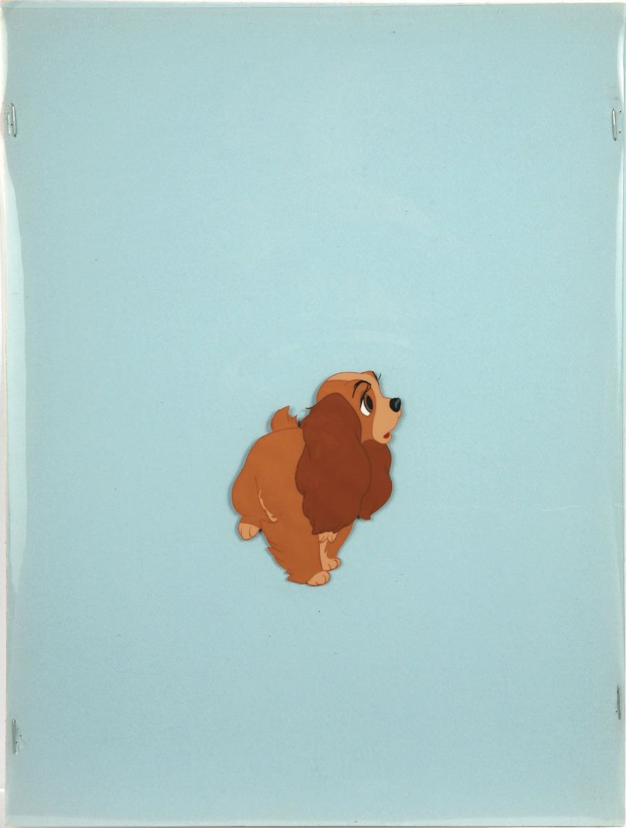 (Walt Disney Studios, 1955) An original hand-painted production cel of Lady from "Lady and the Tramp". This cel was sold at the Disneyland Art Corner, and still retains its original Walt Disney Productions gold label on the reverse. The cel is lightly stapled along the edges to its original backing and measures 12"x9". In very fine condition.