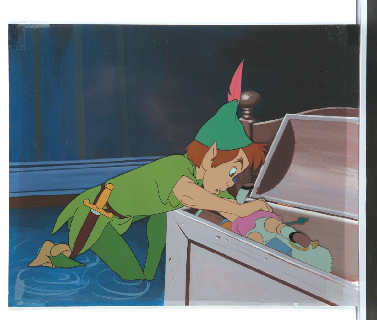 (Walt Disney Productions, 1953) An original hand-painted production cel from "Peter Pan". This cel features the character Peter Pan as he searches through the Darling's nursery for his shadow. This cel-set up contains Peter on the top cel layer, and the items in the toy box on the cel layer below it. These cels have been placed over a hand-painted recreated background made for this cel set-up. The overall piece measures 10.5"x13". In very fine condition with minimal wear and small staple holes in the corners of the cels.
