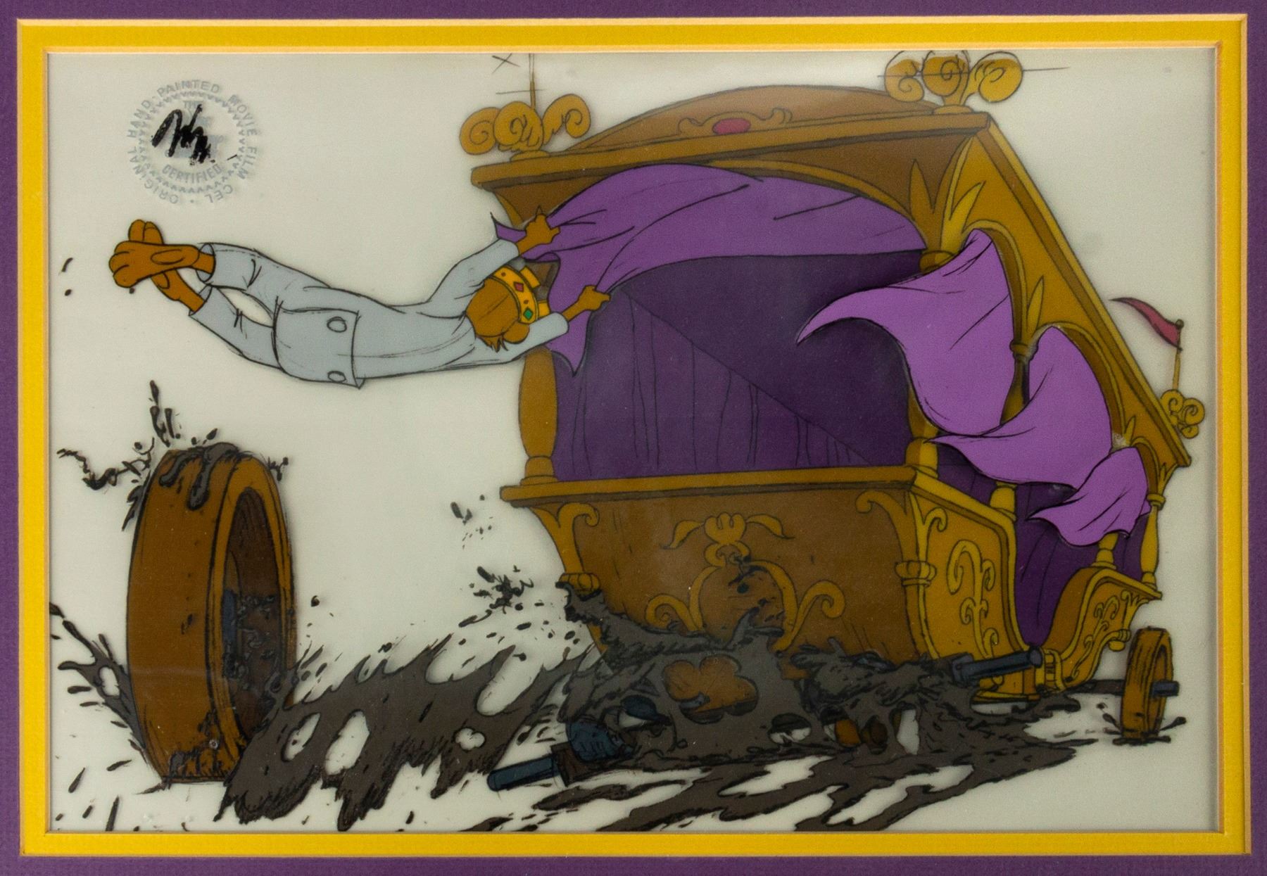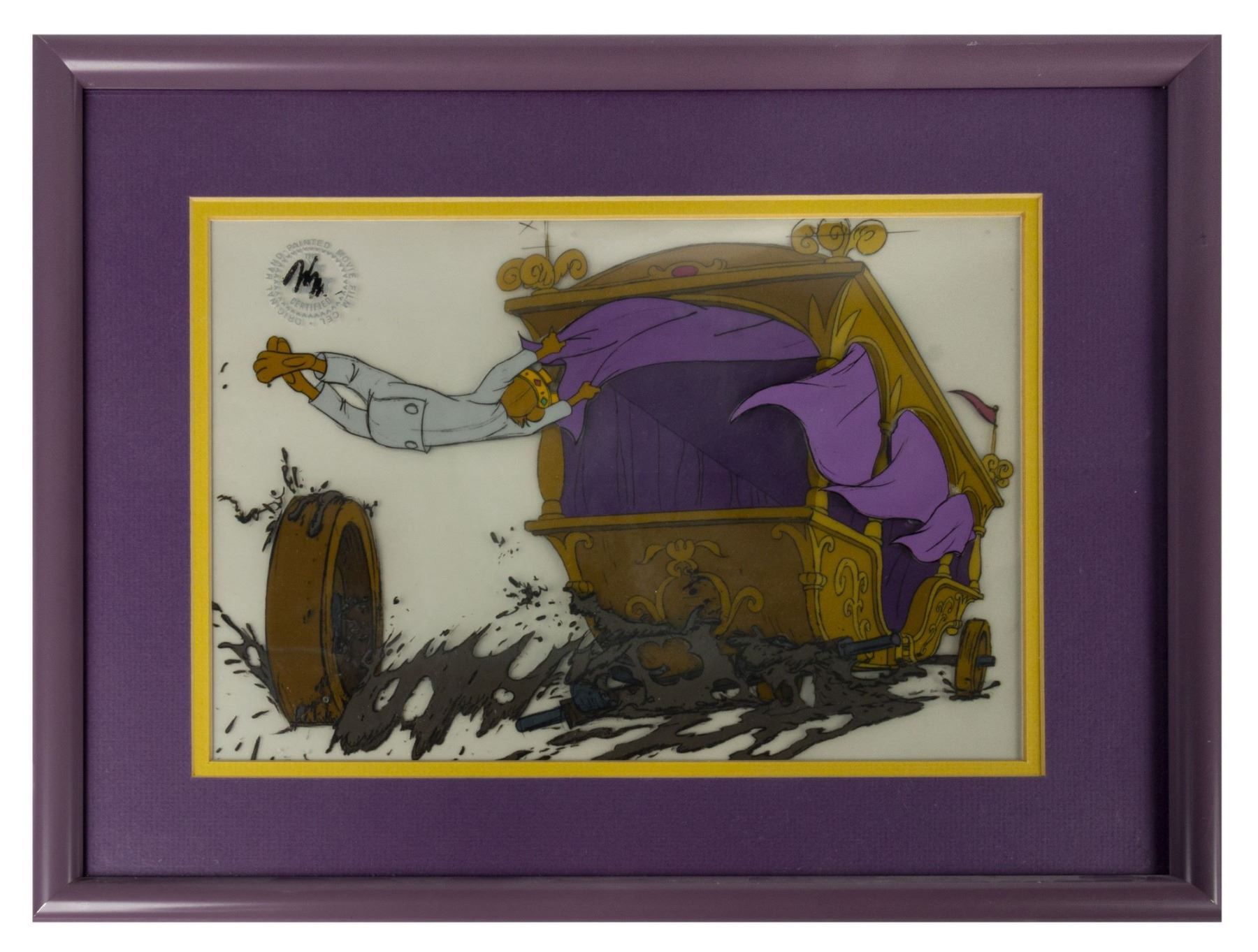 (Walt Disney Studios, 1973) An original production cel of Prince John and his carriage from Walt Disney's Robin Hood. The hand-painted cel features the Walt Disney Company seal in the top-left corner. The cel has an image size of 9.5"x13.5" within its custom 15.25"x19.75" frame. The cel has not been examined out of frame, but appears to be in very good condition. It appears that the cels have been laminated, a common practice for cels from this era that were sold by Disney, however the laminate seems to be holding up well, with just minor wear to a few small areas.