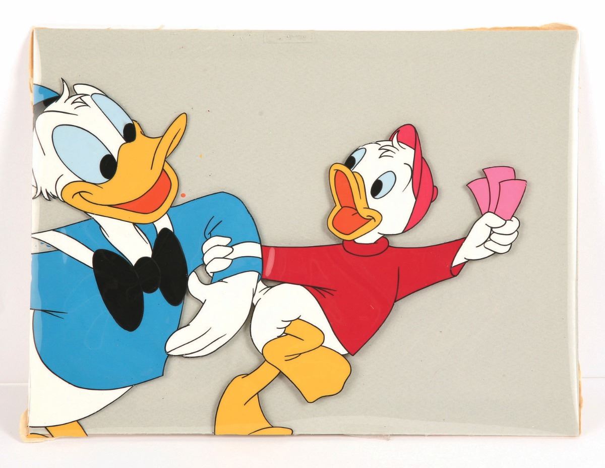 (Walt Disney Studios, 1958) An original hand-painted production cel of Donald Duck and his nephew Huey. This cel was sold at the Disneyland Art Corner, and still retains its original gold label on the reverse of its board backing. The cel is lightly taped to its original backing and measures 7.5"x10". In good condition with minimal wear to the cel paint.