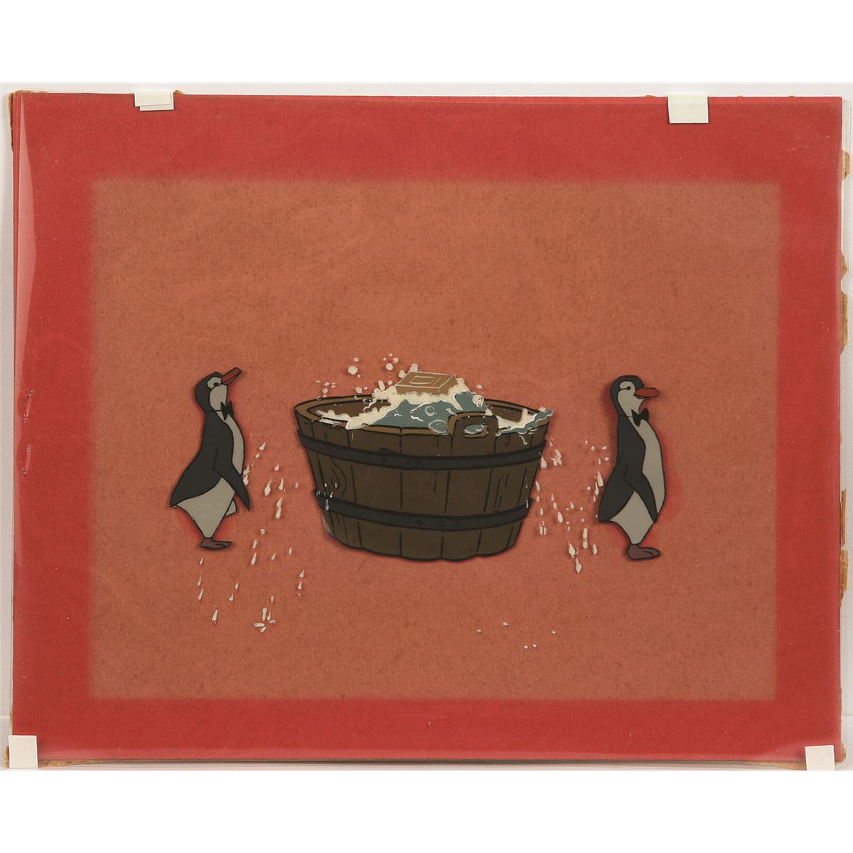 (Disney Studio, 1964) Original production cel of penguins from "Mary Poppins". The cel has been trimmed to 8" x 10" as prepared for sale at the Art Corner in Disneyland. The Disneyland gold label is on the reverse. The total image size is   2.5" x 6" in very good condition.