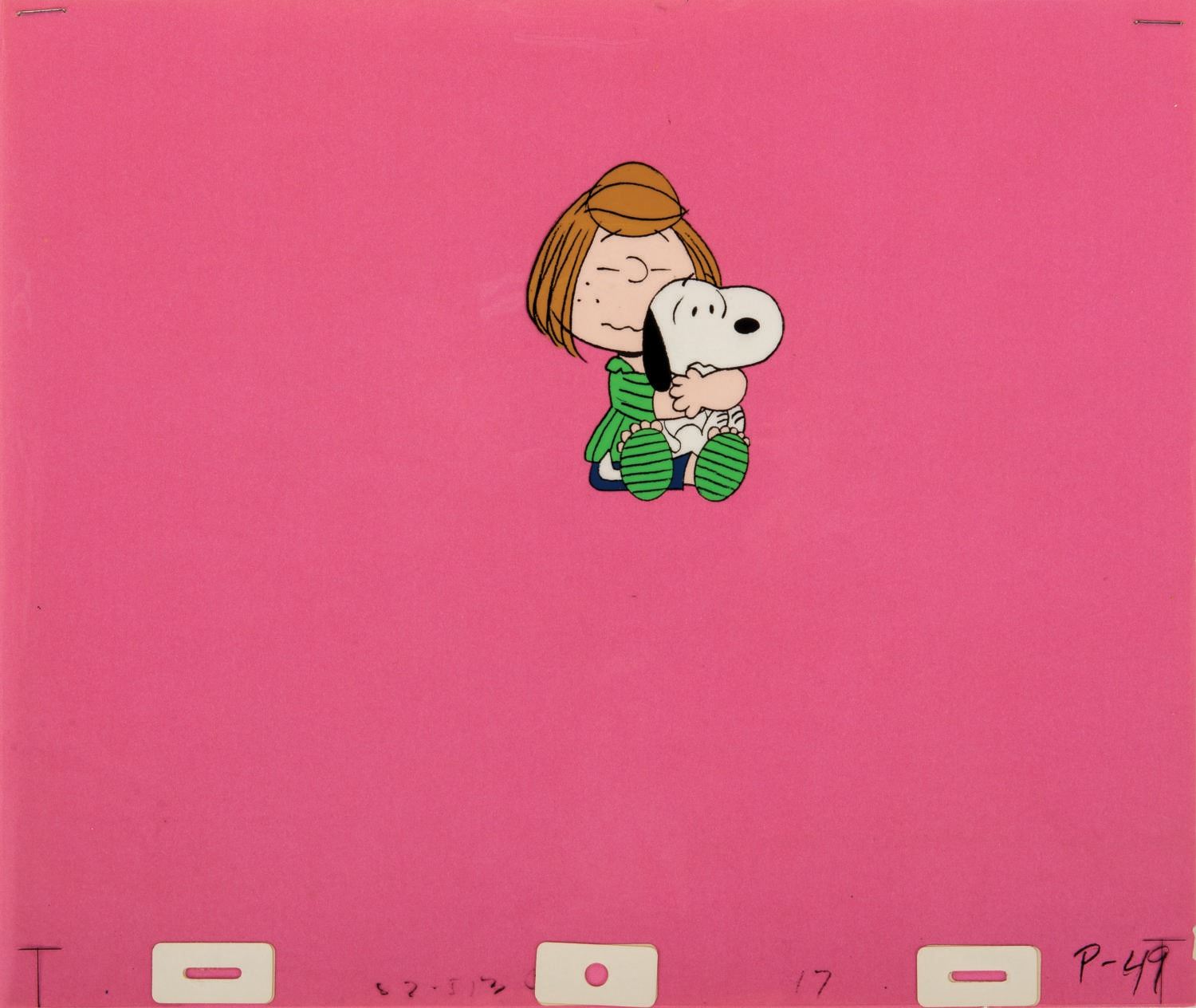 (Bill Melendez, c.1980s) (Bill Melendez, c.1980s) An original production cel featuring Peppermint Patty and Snoopy from a 1980s production. The untrimmed 10.5"x12.5" cel has a total image size of 3.5"x2.75" and has been placed on a color paper background. The Cel is in fine condition