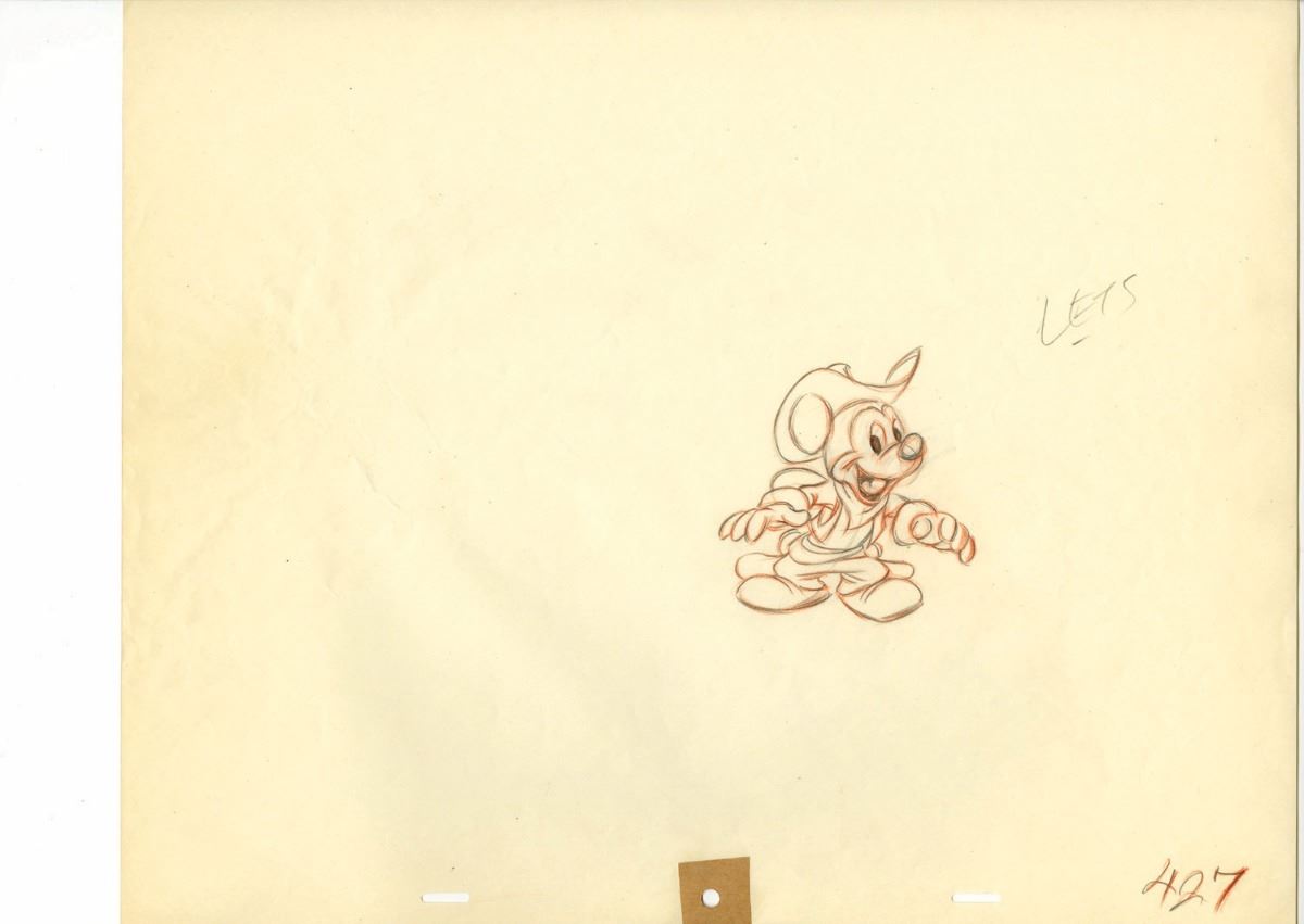 (Walt Disney Studios, c.1955) Original production drawing featuring Mickey Mouse from the "Talent Roundup Day" sequence of the show. The drawing, by animator John Lounsbery, is accomplished in graphite and colored pencil on untrimmed 12.5"x15.5" animation paper. In fine condition.