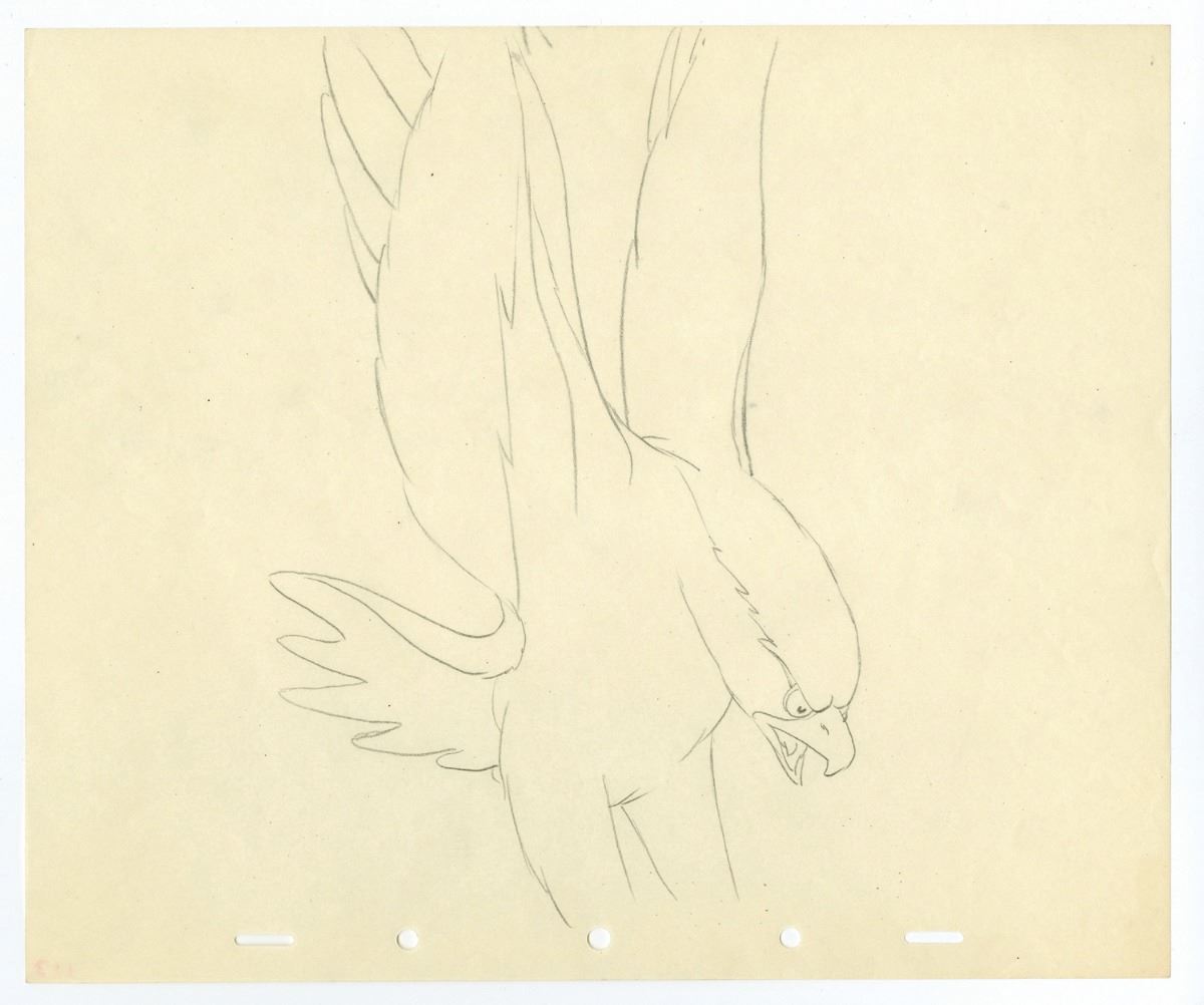 (Walt Disney Studios, 1943) Beautiful production model drawing of the Eagle from "Victory Through Air Power". Created by the animator to plan out the character's movement for the end scene of the film. Accomplished in graphite on 10"x12" animation paper with an image size of 9.5"x6". In fine condition.