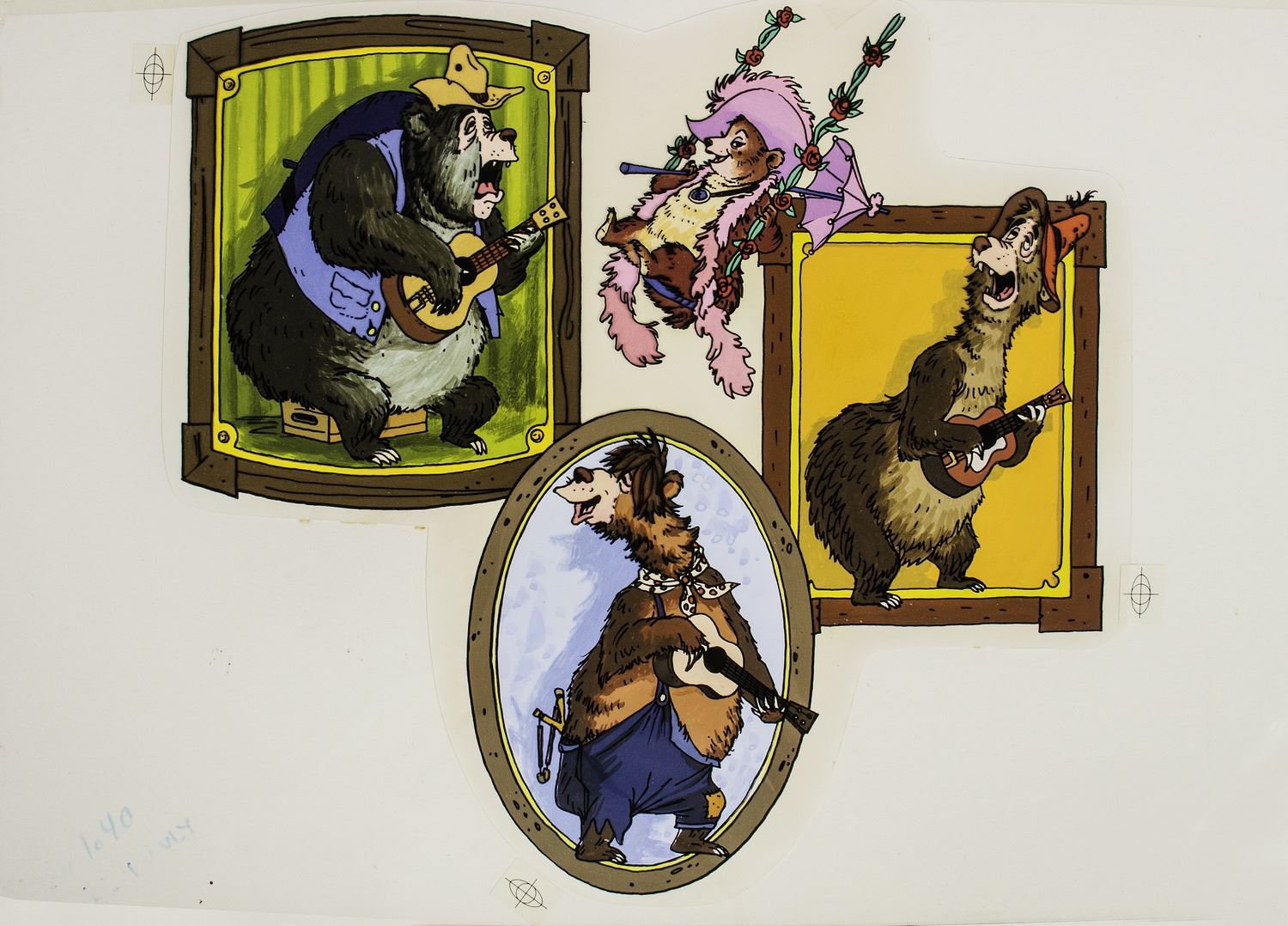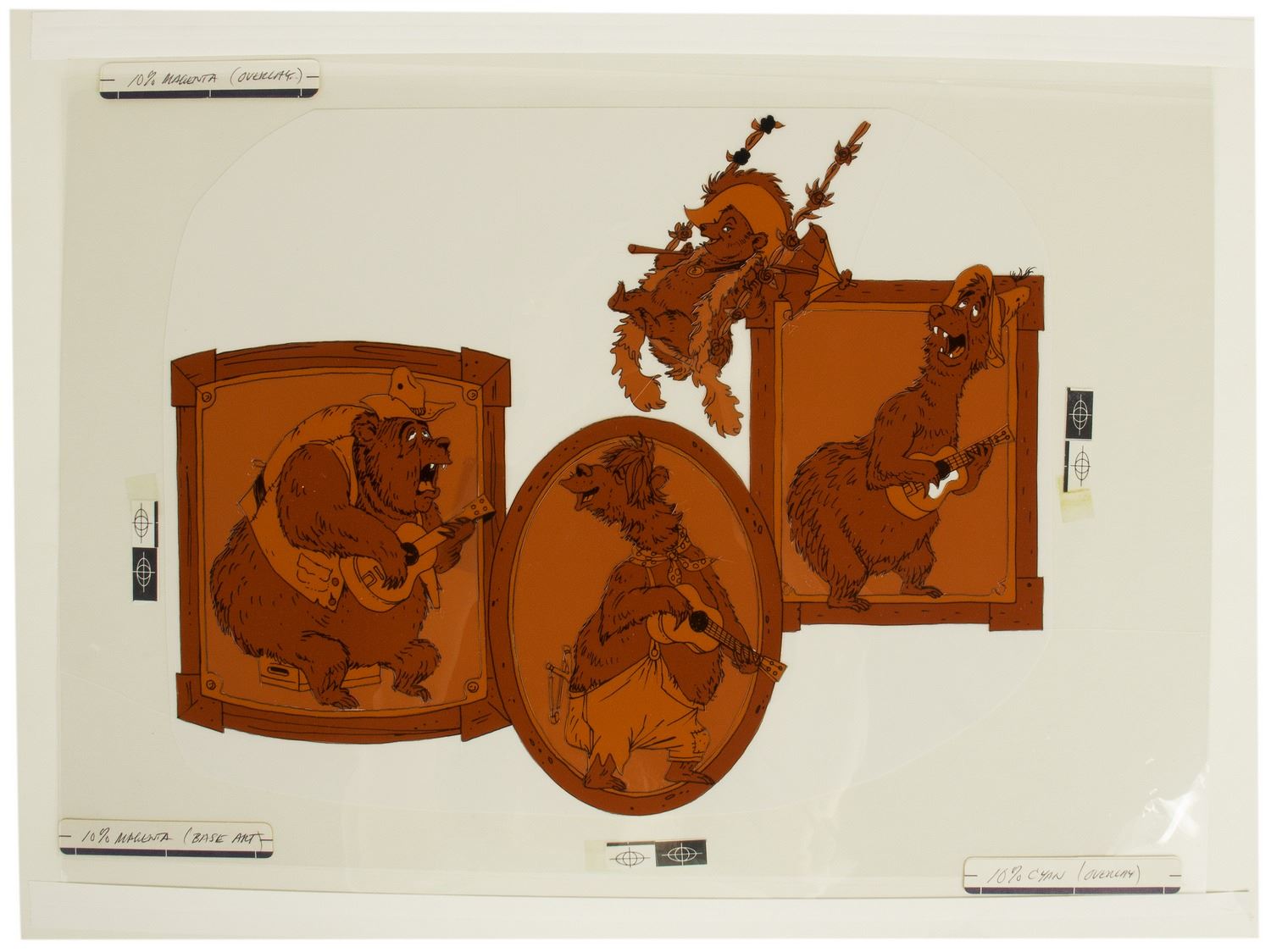 (Disneyland, 1972) An original painting featuring the attraction's main cast, created to promote the "Country Bear Jamboree" at Disneyland. The image was used in various promotional materials during 1972 including the center spread of the popular "Country Bear Jamboree" newspaper supplement that was included with various California newspapers to promote the attraction. The artwork is accomplished in acrylic on artist's board, and features two cel layers that contain the black lines for the illustration as well as a solid black silhouette of the image. Also included is a trimmed photostat print of the line-artwork, and a color-separation layered version of the artwork. The photostat and color-separation versions are also mounted to artist's board. The set measures approximately 15"x20" and is in very good condition.