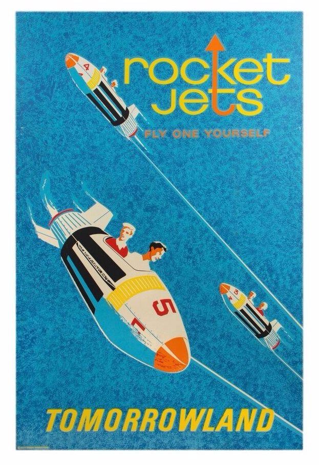 (Disneyland, 1967) An original hand-silkscreened poster for the "Rocket Jets" attraction. Designed by Ken Chapman, this poster borrows heavily from Bjorn Aronson's "Astrojets" poster design, which this attraction replaced. This item measures 54"x36" and is in very good condition, mounted to a foam core backing, with very minor edge-wear and some faint creasing.