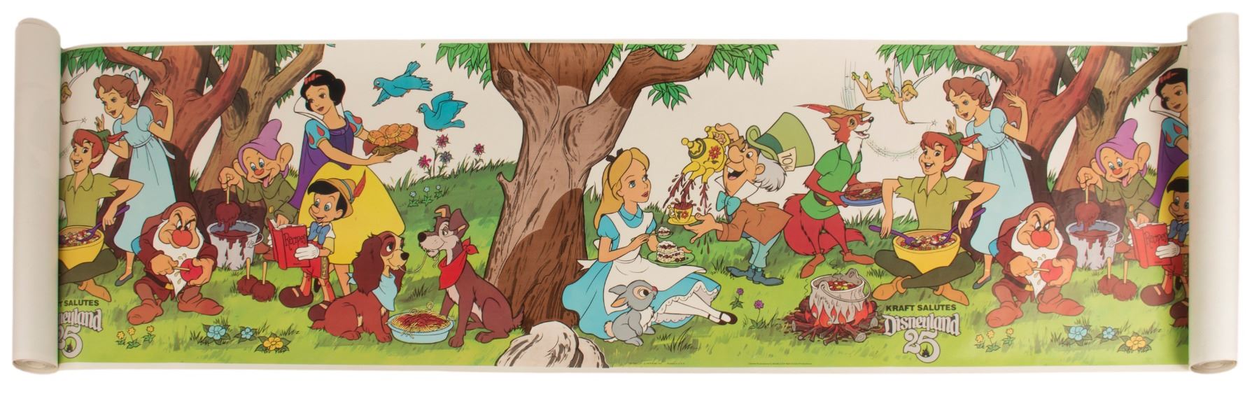 (Disneyland, 1980) An original roll of a paper designed by Kraft Foods as part of the "Kraft Salutes" Disneyland 25th Anniversary promotion. This large banner features repeating imagery of characters from Lady and the Tramp, Snow White, Peter Pan, Robin Hood, Alice in Wonderland, and Pinocchio. The banner artwork measures 15.5" tall and measures 2" in diameter when rolled. The condition is very good, with some expected wear to the outer layer of the rolled banner and some edge-wear along the top and bottom.