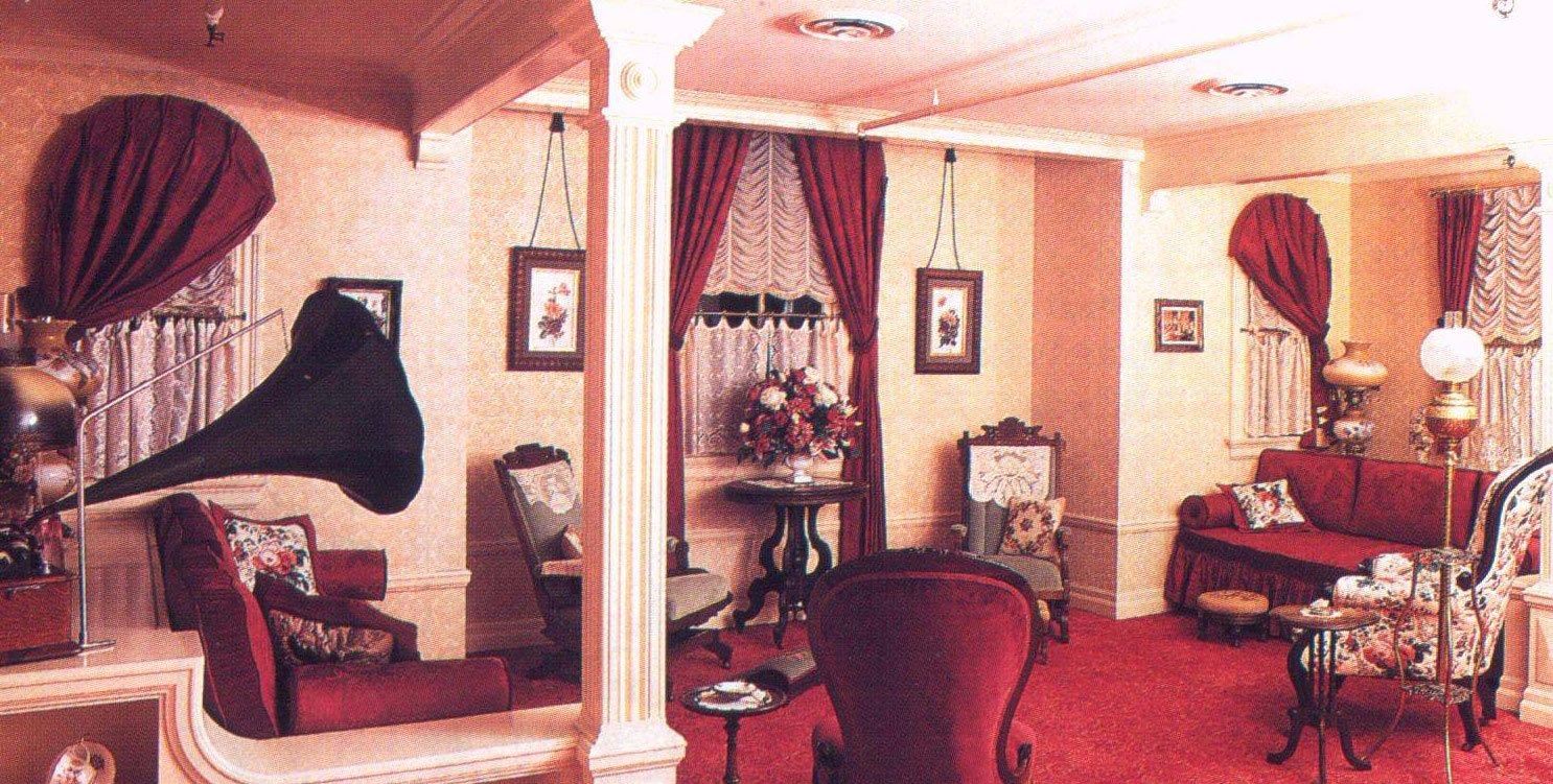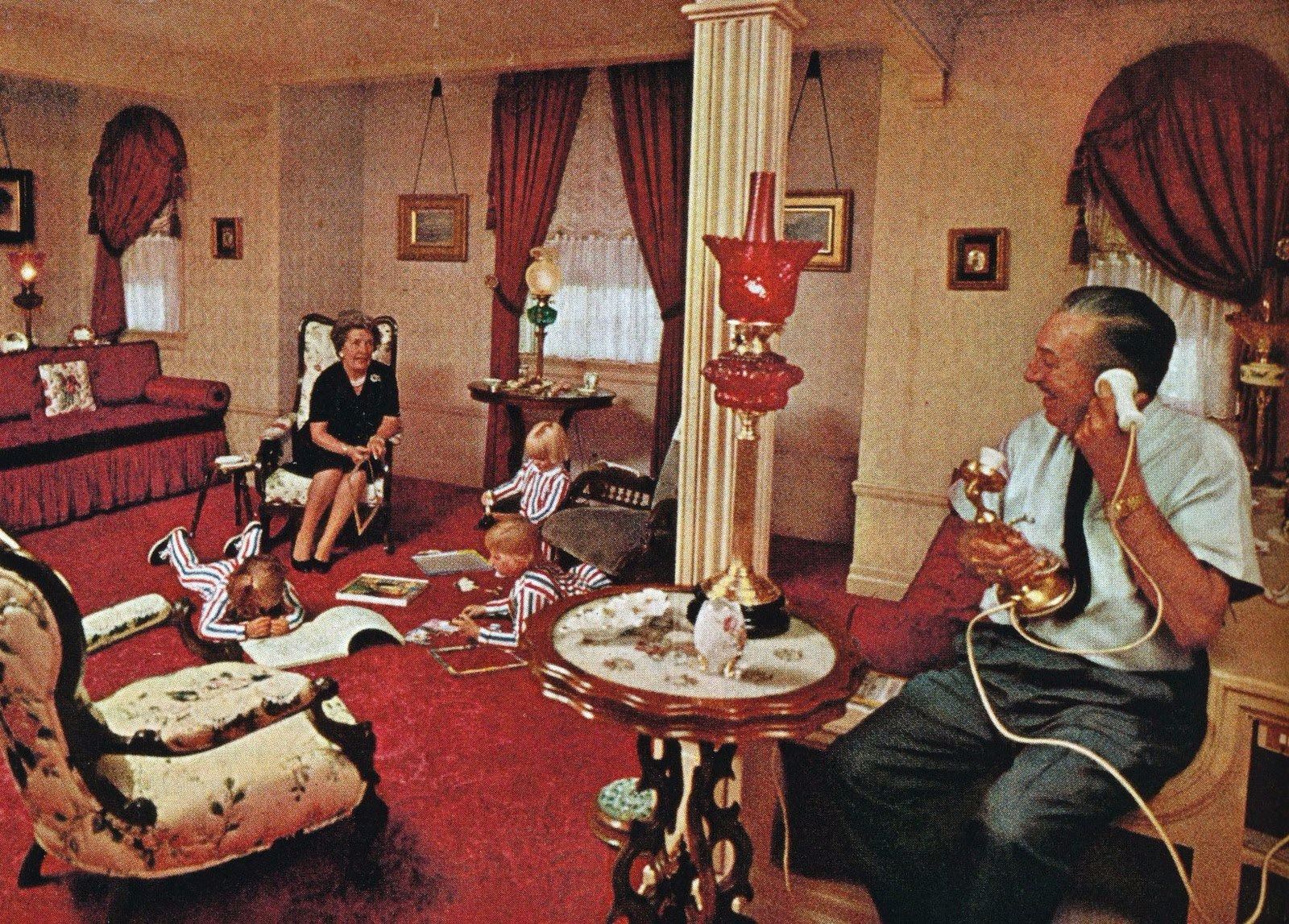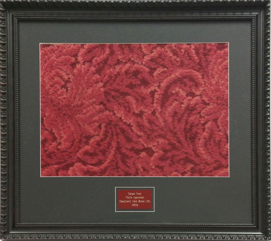 (Disneyland, 1955) During the construction of Disneyland, Walt Disney wanted a place where he could stay and observe the progress of his park. The ideal place for this became Main Street, so Walt had a special apartment built on the second story of the Main Street Firehouse where he and his family could stay. The small yet fully-functional apartment was decorated to simulate a "firehouse" look with reds and whites throughout. This framed swatch of carpet comes from Walt's original apartment and was removed during a later refurbishment. This item measures 13.75"x19.5" within its 24.5"x28" frame. This item is in very good condition with a custom plaque at the bottom of the frame which gives the details on the item.