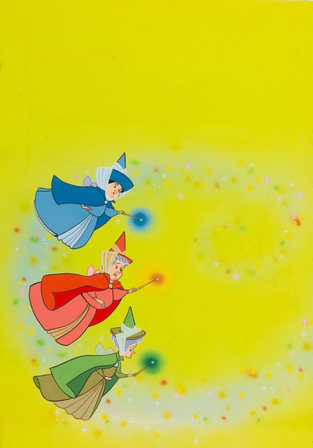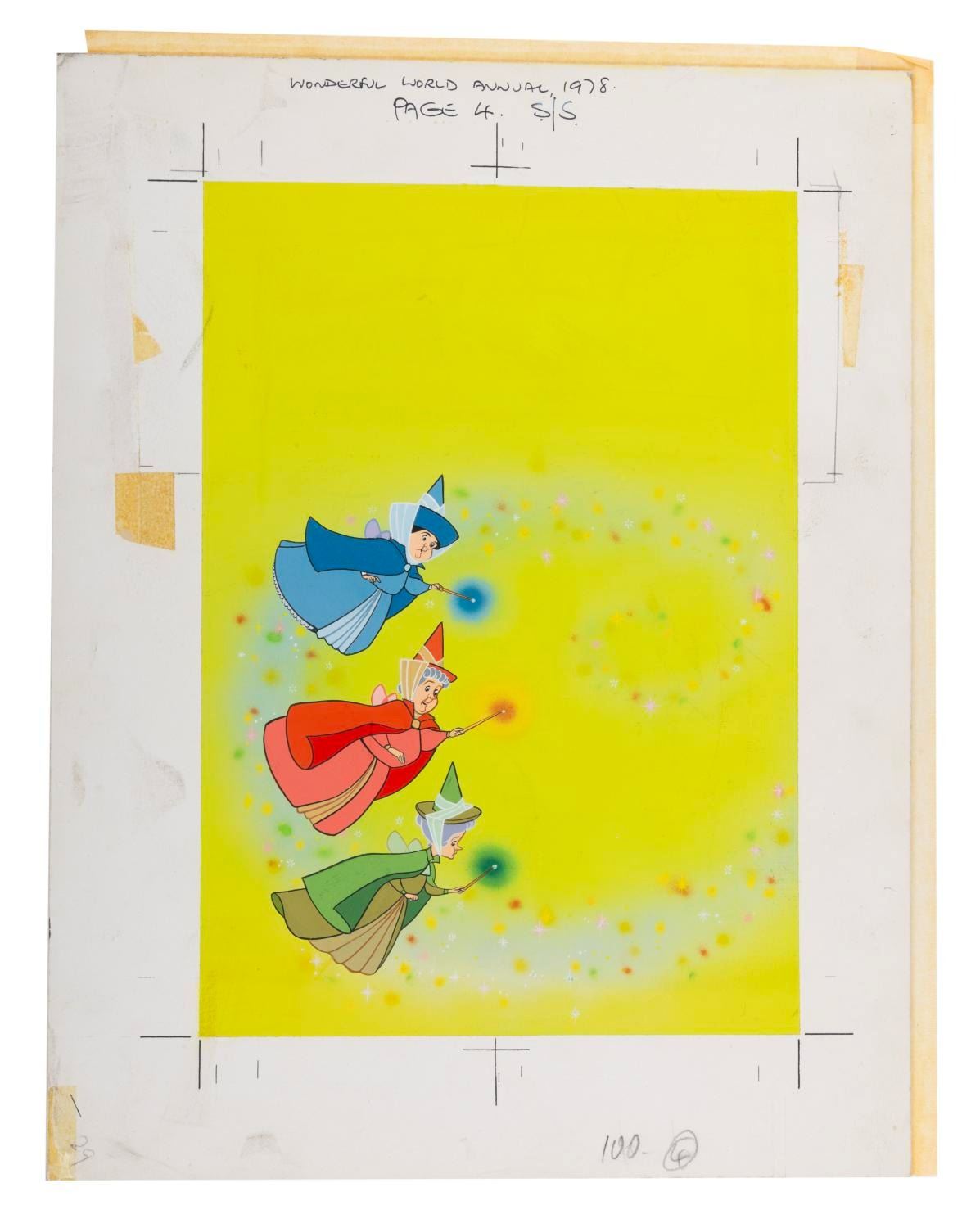 (Disney, 1978) A rare piece of original book art featuring Sleeping Beauty’s Flora, Fauna, and Merryweather from the 1981 Wonderful World of Knowledge Yearbook. The yearbooks were supplements to Disney’s Wonderful World of Knowledge encyclopedia sets and were published by Danbury Press from 1977 to 1988. Accomplished in Gouache on 11" x 14.5" artists’ board, the image size measures 7.5" x 10.5". The artwork is in very good condition with printers notations and some tape residue from previous mountings along the edges.