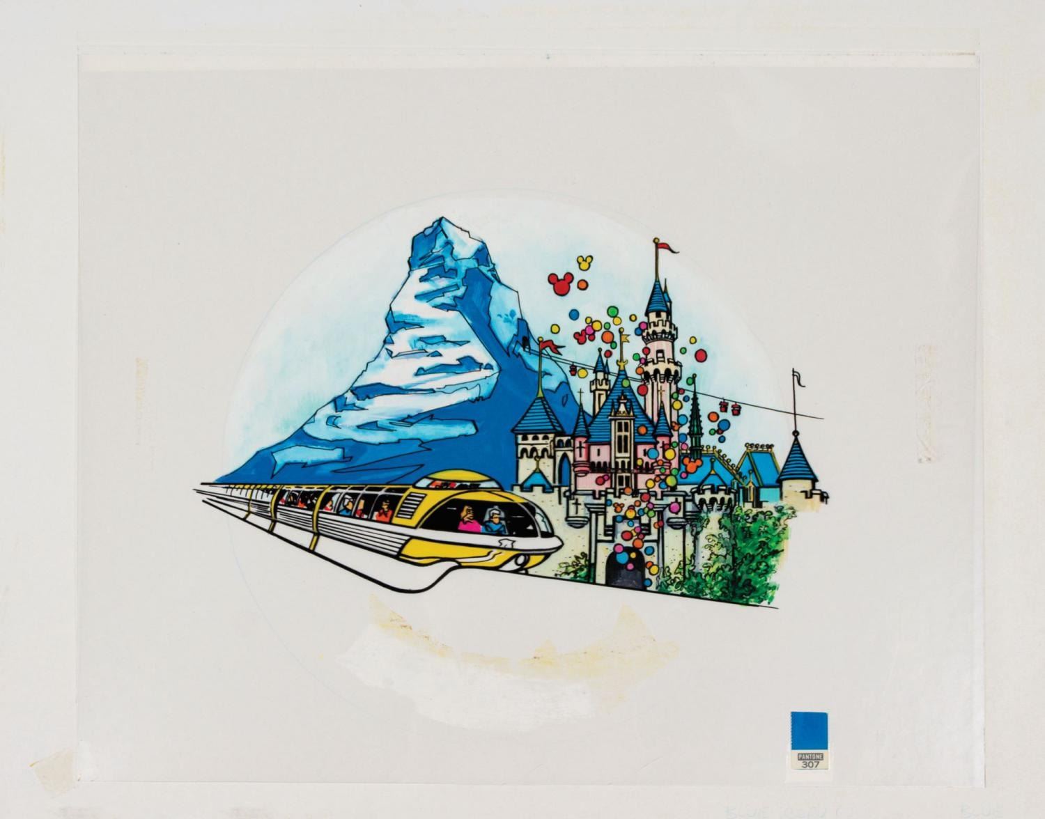 (Disneyland, 1970s) An original painting used in the creation of a Disneyland souvenir drink tray. Also referred to as "well trays," these souvenir trays had several recessed circular holders for carrying drinks, each of which was decorated with imagery of a popular park attraction. This painting depicts a scene including Sleeping Beauty Castle, the Monorail, and the Matterhorn. Accomplished in acrylic on art board with an additional painted black line layer, the painting has an image size of 10.75" in diameter on the 16"x20" board. The condition is very good with some adhesive yellowing to the black line overlay layer.